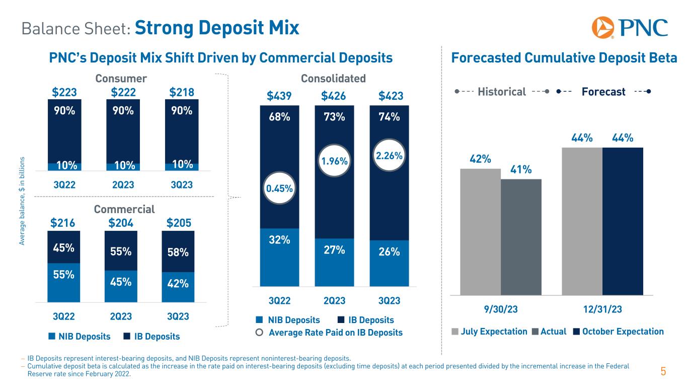 Balance Sheet: Large and Diversified Lending Franchise 4 Av er ag e ba la nc es , $ b ill io ns $98.9 $100.3 $100.9 $101.3 $101.8 $214.1 $221.6 $224.6 $223.2 $217.7 $313.0 $321.9 $325.5 $324.5 $319.5 3.98% 4.75% 5.29% 5.57% 5.75% 3Q22 4Q22 1Q23 2Q23 3Q23 Consumer Commercial Total Loan Yield − YoY represents change in average balances year over year, and LQ represents change in average balances linked quarter. Commercial Loans:  +1.7% YoY  -2.5% LQ Consumer Loans:  +3.0% YoY  +0.5% LQ Average Loan Balances +2.1% Year Over Year; -1.5% Linked Quarter