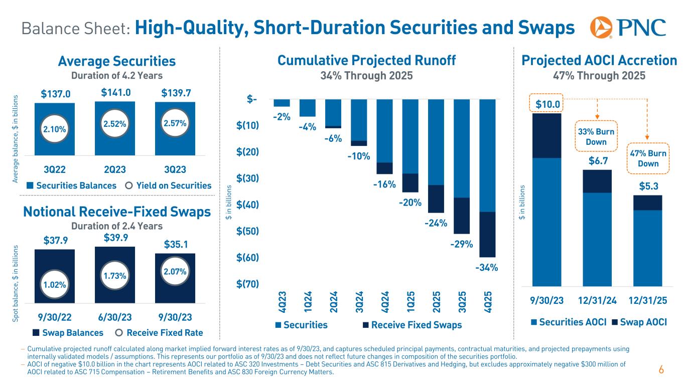 32% 27% 26% 68% 73% 74% 0.45% 1.96% 2.26% 3Q22 2Q23 3Q23 Balance Sheet: Strong Deposit Mix 5 − IB Deposits represent interest-bearing deposits, and NIB Deposits represent noninterest-bearing deposits. − Cumulative deposit beta is calculated as the increase in the rate paid on interest-bearing deposits (excluding time deposits) at each period presented divided by the incremental increase in the Federal Reserve rate since February 2022. PNC’s Deposit Mix Shift Driven by Commercial Deposits 10% 10% 10% 90% 90% 90% 3Q22 2Q23 3Q23 55% 45% 42% 45% 55% 58% 3Q22 2Q23 3Q23 Consumer Commercial Consolidated IB DepositsNIB Deposits IB DepositsNIB Deposits $223 $218 $216 $204 $439 $423 Av er ag e ba la nc e, $ in b ill io ns Forecasted Cumulative Deposit Beta $426$222 $205 Average Rate Paid on IB Deposits 42% 44% 41% 44% 9/30/23 12/31/23 Historical October ExpectationActualJuly Expectation Forecast