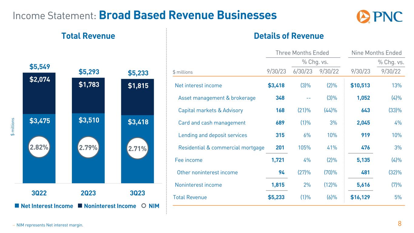 Income Statement: Solid Results 7− Pretax, pre-provision earnings (non-GAAP) – See Reconciliation in Appendix. − Net interest margin is calculated using taxable-equivalent net interest income, a non-GAAP measure, a reconciliation of which is provided in the Appendix. Three Months Ended Nine Months Ended % Change vs. % Change vs. $ in millions 9/30/23 6/30/23 9/30/22 9/30/23 9/30/22 Net interest income $3,418 (3)% (2)% $10,513 13% Noninterest income 1,815 2% (12)% 5,616 (7)% Total revenue 5,233 (1)% (6)% 16,129 5% Noninterest expense 3,245 (4)% (1)% 9,938 2% Pretax, pre-provision earnings (non-GAAP) $1,988 3% (12)% $6,191 9% Provision for credit losses $129 (12)% (46)% $510 n/m Income taxes $289 5% (26)% $917 (11)% Net income $1,570 5% (4)% $4,764 4% 3Q23 2Q23 3Q22 9/30/23 9/30/22 Noninterest income to total revenue 35% 34% 37% 35% 39% Net interest margin (non-GAAP) 2.71% 2.79% 2.82% 2.78% 2.54% Diluted EPS $3.60 $3.36 $3.78 $10.94 $10.39