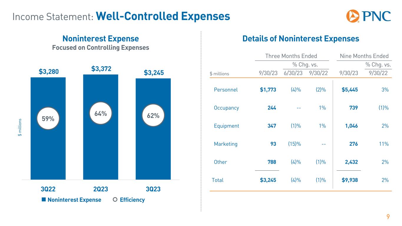 Income Statement: Broad Based Revenue Businesses 8 $ m ill io ns Total Revenue $3,475 $3,510 $3,418 $2,074 $1,783 $1,815 $5,549 $5,293 $5,233 2.82% 2.79% 2.71% 3Q22 2Q23 3Q23 Details of Revenue Net Interest Income NIMNoninterest Income Three Months Ended Nine Months Ended % Chg. vs. % Chg. vs. $ millions 9/30/23 6/30/23 9/30/22 9/30/23 9/30/22 Net interest income $3,418 (3)% (2)% $10,513 13% Asset management & brokerage 348 -- (3)% 1,052 (4)% Capital markets & Advisory 168 (21)% (44)% 643 (33)% Card and cash management 689 (1)% 3% 2,045 4% Lending and deposit services 315 6% 10% 919 10% Residential & commercial mortgage 201 105% 41% 476 3% Fee income 1,721 4% (2)% 5,135 (4)% Other noninterest income 94 (27)% (70)% 481 (32)% Noninterest income 1,815 2% (12)% 5,616 (7)% Total Revenue $5,233 (1)% (6)% $16,129 5% − NIM represents Net interest margin.