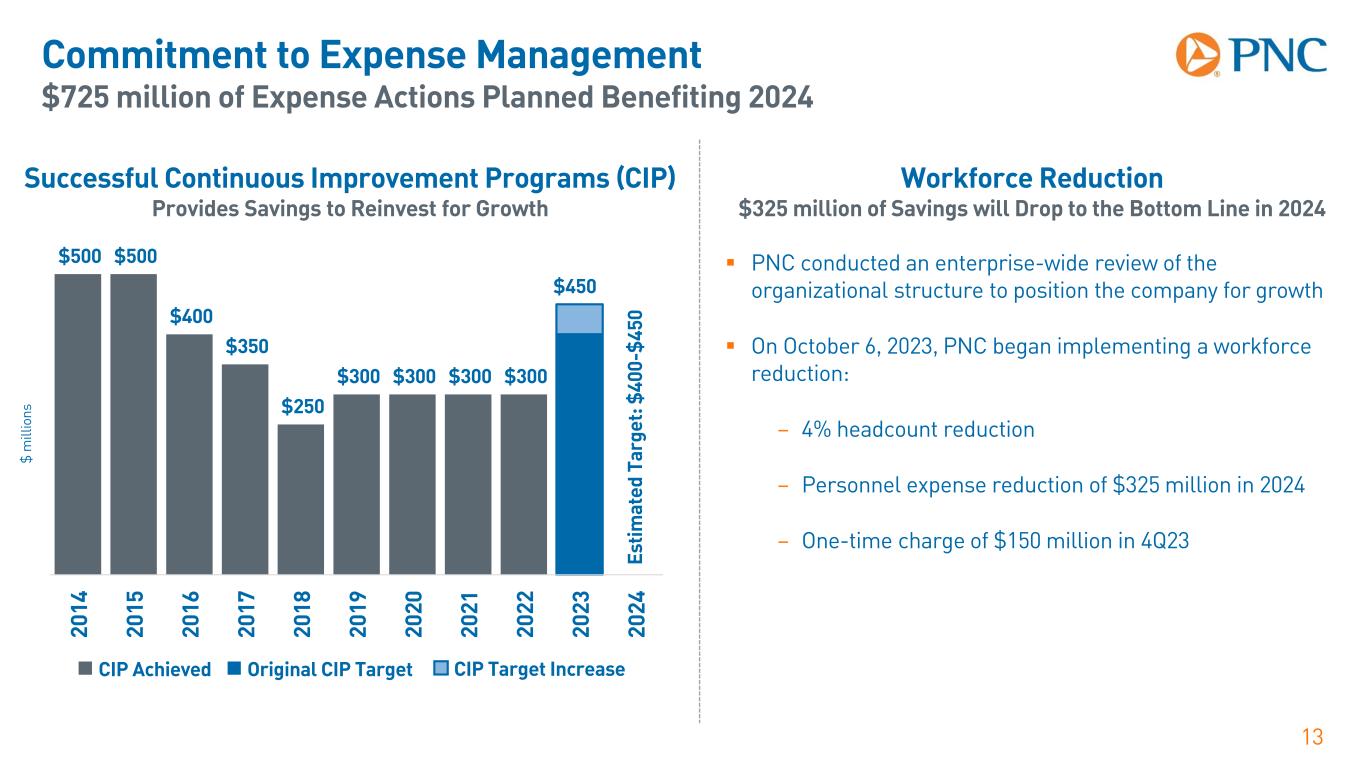 Acquired Capital Commitment Revolving Facilities 12 Transaction Summary Closing Date: October 2, 2023 Loan Commitments: ~$16 billion Funded Loans: $9.0 billion Price (of par value): 99.0% Estimated 4Q23 EPS accretion: $0.10 Utilization: 54% Criticized Loans: 0.0% Average Advance Rate: 67%  Strategic Rationale – Grows PNC’s capital commitments business with minimal investment – Origination strategy focused on large and established fund managers – Financially attractive, with discounted purchase price – Builds on PNC’s suite of offerings serving the private equity industry  High Quality Loans – Facilities are secured by uncalled capital commitments – Borrowing capacity based on advance rates – Expectation is to retain 75% of the portfolio