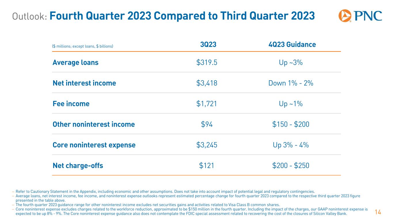 Commitment to Expense Management $725 million of Expense Actions Planned Benefiting 2024 13 Successful Continuous Improvement Programs (CIP) Provides Savings to Reinvest for Growth Workforce Reduction $325 million of Savings will Drop to the Bottom Line in 2024 $500 $500 $400 $350 $250 $300 $300 $300 $300 $450 20 14 20 15 20 16 20 17 20 18 20 19 20 20 20 21 20 22 20 23 20 24 $ m ill io ns CIP Achieved  PNC conducted an enterprise-wide review of the organizational structure to position the company for growth  On October 6, 2023, PNC began implementing a workforce reduction: – 4% headcount reduction – Personnel expense reduction of $325 million in 2024 – One-time charge of $150 million in 4Q23 Original CIP Target CIP Target Increase Es tim at ed T ar ge t: $ 40 0- $4 50