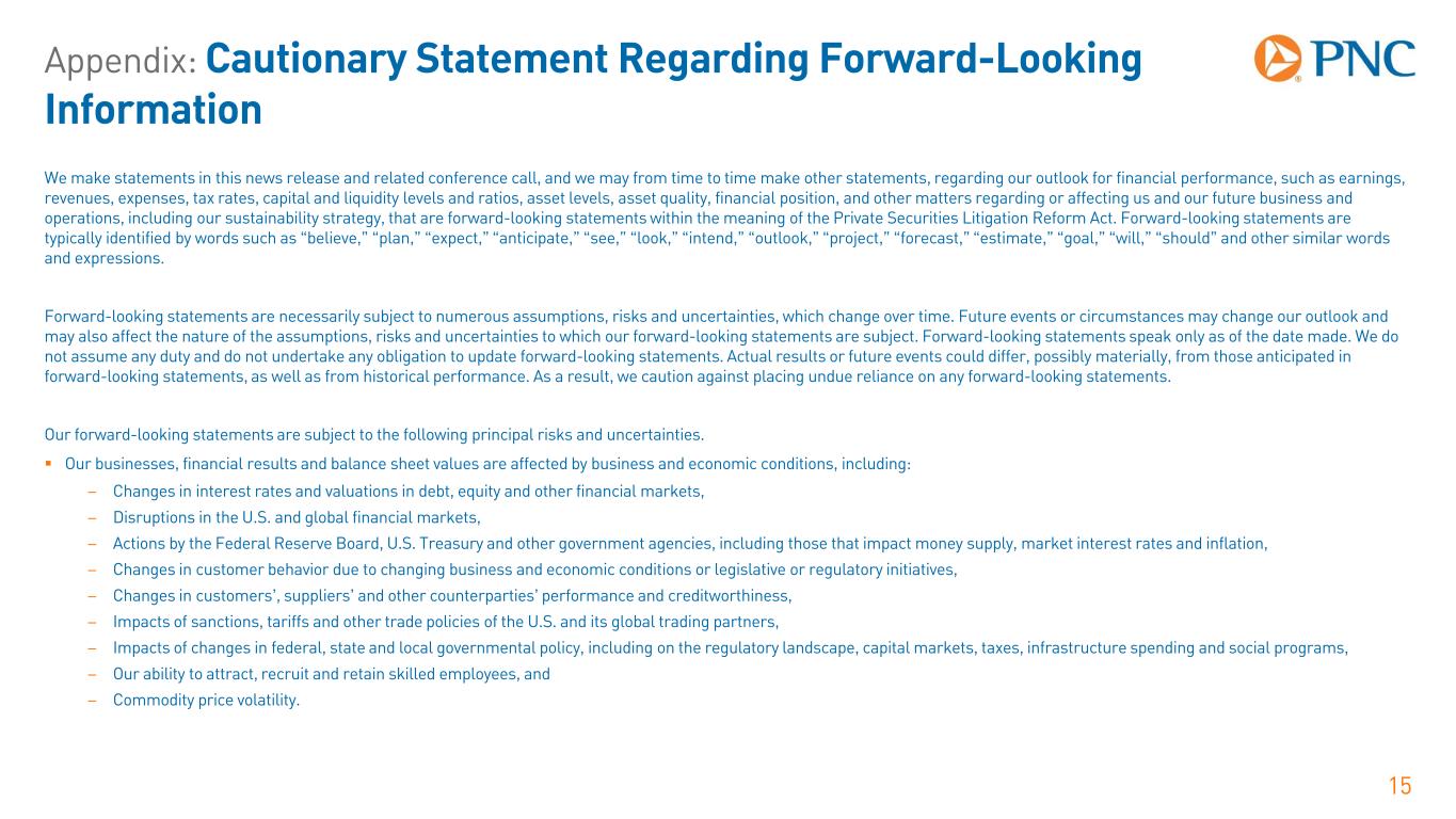 Appendix: Cautionary Statement Regarding Forward-Looking Information 15 We make statements in this news release and related conference call, and we may from time to time make other statements, regarding our outlook for financial performance, such as earnings, revenues, expenses, tax rates, capital and liquidity levels and ratios, asset levels, asset quality, financial position, and other matters regarding or affecting us and our future business and operations, including our sustainability strategy, that are forward-looking statements within the meaning of the Private Securities Litigation Reform Act. Forward-looking statements are typically identified by words such as “believe,” “plan,” “expect,” “anticipate,” “see,” “look,” “intend,” “outlook,” “project,” “forecast,” “estimate,” “goal,” “will,” “should” and other similar words and expressions. Forward-looking statements are necessarily subject to numerous assumptions, risks and uncertainties, which change over time. Future events or circumstances may change our outlook and may also affect the nature of the assumptions, risks and uncertainties to which our forward-looking statements are subject. Forward-looking statements speak only as of the date made. We do not assume any duty and do not undertake any obligation to update forward-looking statements. Actual results or future events could differ, possibly materially, from those anticipated in forward-looking statements, as well as from historical performance. As a result, we caution against placing undue reliance on any forward-looking statements. Our forward-looking statements are subject to the following principal risks and uncertainties.  Our businesses, financial results and balance sheet values are affected by business and economic conditions, including: − Changes in interest rates and valuations in debt, equity and other financial markets, − Disruptions in the U.S. and global financial markets, − Actions by the Federal Reserve Board, U.S. Treasury and other government agencies, including those that impact money supply, market interest rates and inflation, − Changes in customer behavior due to changing business and economic conditions or legislative or regulatory initiatives, − Changes in customers’, suppliers’ and other counterparties’ performance and creditworthiness, − Impacts of sanctions, tariffs and other trade policies of the U.S. and its global trading partners, − Impacts of changes in federal, state and local governmental policy, including on the regulatory landscape, capital markets, taxes, infrastructure spending and social programs, − Our ability to attract, recruit and retain skilled employees, and − Commodity price volatility.