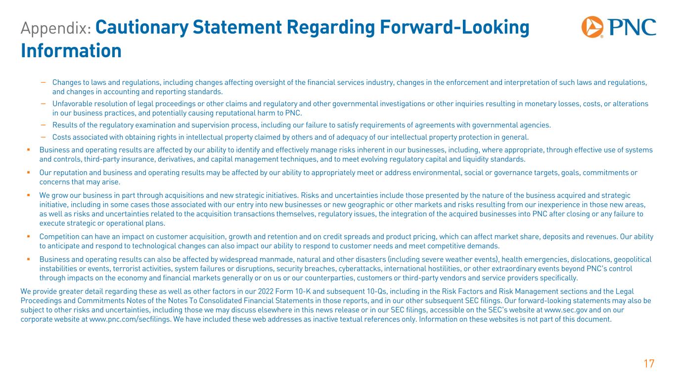 Appendix: Cautionary Statement Regarding Forward-Looking Information 16  Our forward-looking financial statements are subject to the risk that economic and financial market conditions will be substantially different than those we are currently expecting and do not take into account potential legal and regulatory contingencies. These statements are based on our views that: − Economic growth accelerated in the first half of 2023, but ongoing Federal Reserve monetary policy tightening to slow inflation is weighing on interest-rate sensitive industries. Sectors where interest rates play an outsized role, such as business investment and consumer spending on durable goods, will contract into 2024. − PNC’s baseline outlook is for a mild recession starting in the first half of 2024, with a small contraction in real GDP of less than 1%, lasting into the second half of 2024. The unemployment rate will increase through the rest of 2023 and throughout 2024, peaking at close to 5% in early 2025. Inflation will slow with weaker demand, moving back to the Federal Reserve’s 2% objective by mid-2024. − PNC expects the federal funds rate to remain unchanged in the near term, between 5.25% and 5.50% through mid-2024, when PNC expects federal funds rate cuts in response to the recession.  PNC’s ability to take certain capital actions, including returning capital to shareholders, is subject to PNC meeting or exceeding a stress capital buffer established by the Federal Reserve Board in connection with the Federal Reserve Board’s Comprehensive Capital Analysis and Review (CCAR) process.  PNC’s regulatory capital ratios in the future will depend on, among other things, the company’s financial performance, the scope and terms of final capital regulations then in effect and management actions affecting the composition of PNC’s balance sheet. In addition, PNC’s ability to determine, evaluate and forecast regulatory capital ratios, and to take actions (such as capital distributions) based on actual or forecasted capital ratios, will be dependent at least in part on the development, validation and regulatory review of related models and the reliability of and risks resulting from extensive use of such models.  Legal and regulatory developments could have an impact on our ability to operate our businesses, financial condition, results of operations, competitive position, reputation, or pursuit of attractive acquisition opportunities. Reputational impacts could affect matters such as business generation and retention, liquidity, funding, and ability to attract and retain employees. These developments could include: