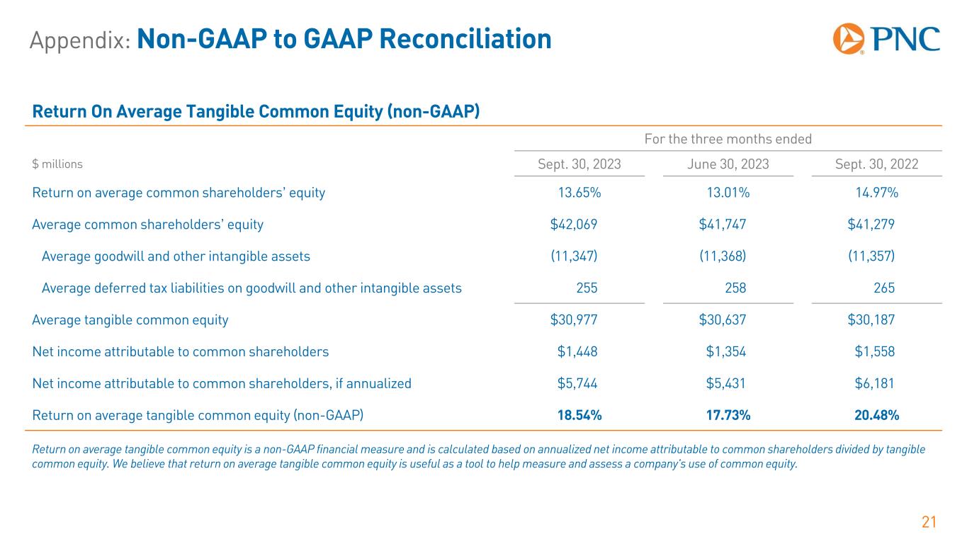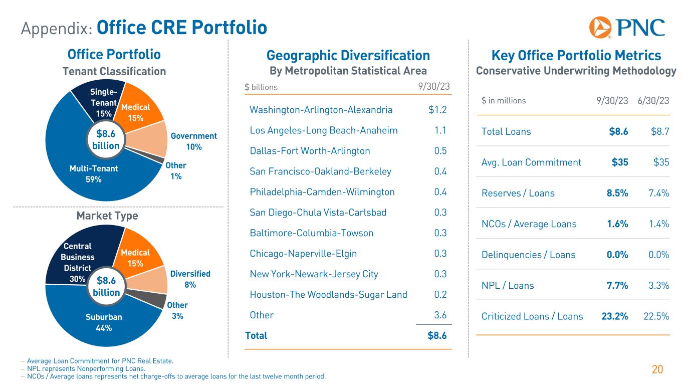 Appendix: Office CRE Portfolio 20 Office Portfolio Multi-Tenant 59% Single- Tenant 15% Medical 15% Government 10% Other 1% $8.6 billion Geographic Diversification By Metropolitan Statistical Area Key Office Portfolio Metrics Conservative Underwriting Methodology Suburban 44% Central Business District 30% Medical 15% Diversified 8% Other 3% $8.6 billion Tenant Classification Market Type $ billions 9/30/23 Washington-Arlington-Alexandria $1.2 Los Angeles-Long Beach-Anaheim 1.1 Dallas-Fort Worth-Arlington 0.5 San Francisco-Oakland-Berkeley 0.4 Philadelphia-Camden-Wilmington 0.4 San Diego-Chula Vista-Carlsbad 0.3 Baltimore-Columbia-Towson 0.3 Chicago-Naperville-Elgin 0.3 New York-Newark-Jersey City 0.3 Houston-The Woodlands-Sugar Land 0.2 Other 3.6 Total $8.6 $ in millions 9/30/23 6/30/23 Total Loans $8.6 $8.7 Avg. Loan Commitment $35 $35 Reserves / Loans 8.5% 7.4% NCOs / Average Loans 1.6% 1.4% Delinquencies / Loans 0.0% 0.0% NPL / Loans 7.7% 3.3% Criticized Loans / Loans 23.2% 22.5% − Average Loan Commitment for PNC Real Estate. − NPL represents Nonperforming Loans. − NCOs / Average loans represents net charge-offs to average loans for the last twelve month period.