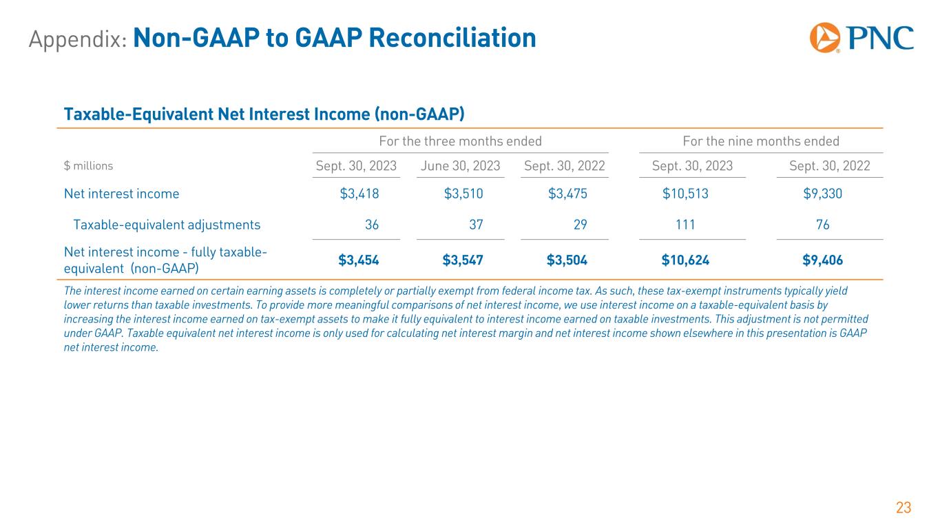 Appendix: Non-GAAP to GAAP Reconciliation 22 Pretax, Pre-Provision Earnings (non-GAAP) For the three months ended For the nine months ended $ millions Sept. 30, 2023 June 30, 2023 Sept. 30, 2022 Sept. 30, 2023 Sept. 30, 2022 Net interest income $3,418 $3,510 $3,475 $10,513 $9,330 Noninterest income 1,815 1,783 2,074 5,616 6,027 Total Revenue $5,233 $5,293 $5,549 $16,129 $15,357 Noninterest expense 3,245 3,372 3,280 9,938 9,696 Pretax, pre-provision earnings $1,988 $1,921 $2,269 $6,191 $5,661 We believe that pretax, pre-provision earnings is a useful tool to help evaluate the ability to provide for credit costs through operations and provides an additional basis to compare results between periods by isolating the impact of provision for (recapture of) credit losses, which can vary significantly between periods.