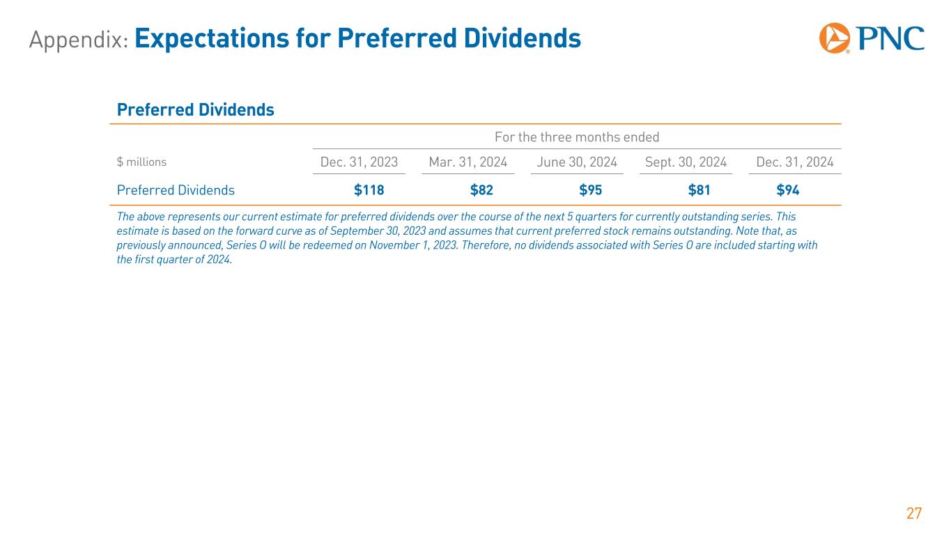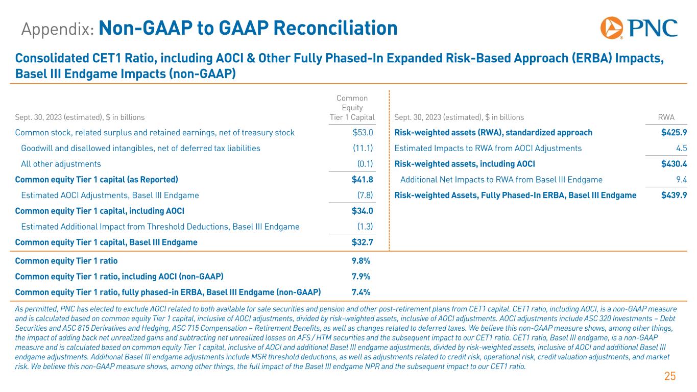 Appendix: Non-GAAP to GAAP Reconciliation 25 Consolidated CET1 Ratio, including AOCI & Other Fully Phased-In Expanded Risk-Based Approach (ERBA) Impacts, Basel III Endgame Impacts (non-GAAP) Sept. 30, 2023 (estimated), $ in billions Common Equity Tier 1 Capital Sept. 30, 2023 (estimated), $ in billions RWA Common stock, related surplus and retained earnings, net of treasury stock $53.0 Risk-weighted assets (RWA), standardized approach $425.9 Goodwill and disallowed intangibles, net of deferred tax liabilities (11.1) Estimated Impacts to RWA from AOCI Adjustments 4.5 All other adjustments (0.1) Risk-weighted assets, including AOCI $430.4 Common equity Tier 1 capital (as Reported) $41.8 Additional Net Impacts to RWA from Basel III Endgame 9.4 Estimated AOCI Adjustments, Basel III Endgame (7.8) Risk-weighted Assets, Fully Phased-In ERBA, Basel III Endgame $439.9 Common equity Tier 1 capital, including AOCI $34.0 Estimated Additional Impact from Threshold Deductions, Basel III Endgame (1.3) Common equity Tier 1 capital, Basel III Endgame $32.7 Common equity Tier 1 ratio 9.8% Common equity Tier 1 ratio, including AOCI (non-GAAP) 7.9% Common equity Tier 1 ratio, fully phased-in ERBA, Basel III Endgame (non-GAAP) 7.4% As permitted, PNC has elected to exclude AOCI related to both available for sale securities and pension and other post-retirement plans from CET1 capital. CET1 ratio, including AOCI, is a non-GAAP measure and is calculated based on common equity Tier 1 capital, inclusive of AOCI adjustments, divided by risk-weighted assets, inclusive of AOCI adjustments. AOCI adjustments include ASC 320 Investments – Debt Securities and ASC 815 Derivatives and Hedging, ASC 715 Compensation – Retirement Benefits, as well as changes related to deferred taxes. We believe this non-GAAP measure shows, among other things, the impact of adding back net unrealized gains and subtracting net unrealized losses on AFS / HTM securities and the subsequent impact to our CET1 ratio. CET1 ratio, Basel III endgame, is a non-GAAP measure and is calculated based on common equity Tier 1 capital, inclusive of AOCI and additional Basel III endgame adjustments, divided by risk-weighted assets, inclusive of AOCI and additional Basel III endgame adjustments. Additional Basel III endgame adjustments include MSR threshold deductions, as well as adjustments related to credit risk, operational risk, credit valuation adjustments, and market risk. We believe this non-GAAP measure shows, among other things, the full impact of the Basel III endgame NPR and the subsequent impact to our CET1 ratio.
