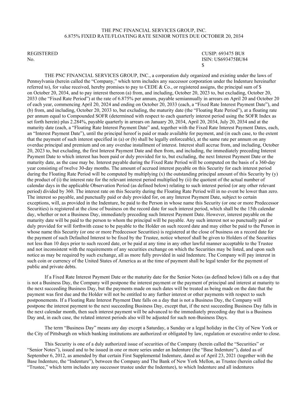 THE PNC FINANCIAL SERVICES GROUP, INC. 6.875% FIXED RATE/FLOATING RATE SENIOR NOTES DUE OCTOBER 20, 2034 REGISTERED CUSIP: 693475 BU8 No. ISIN: US693475BU84 $ THE PNC FINANCIAL SERVICES GROUP, INC., a corporation duly organized and existing under the laws of Pennsylvania (herein called the “Company,” which term includes any successor corporation under the Indenture hereinafter referred to), for value received, hereby promises to pay to CEDE & Co., or registered assigns, the principal sum of $ on October 20, 2034, and to pay interest thereon (a) from, and including, October 20, 2023 to, but excluding, October 20, 2033 (the “Fixed Rate Period”) at the rate of 6.875% per annum, payable semiannually in arrears on April 20 and October 20 of each year, commencing April 20, 2024 and ending on October 20, 2033 (each, a “Fixed Rate Interest Payment Date”), and (b) from, and including, October 20, 2033 to, but excluding, the maturity date (the “Floating Rate Period”), at a floating rate per annum equal to Compounded SOFR (determined with respect to each quarterly interest period using the SOFR Index as set forth herein) plus 2.284%, payable quarterly in arrears on January 20, 2034, April 20, 2034, July 20, 2034 and at the maturity date (each, a “Floating Rate Interest Payment Date” and, together with the Fixed Rate Interest Payment Dates, each, an “Interest Payment Date”), until the principal hereof is paid or made available for payment, and (in each case, to the extent that the payment of such interest specified in (a) or (b) shall be legally enforceable), at the same rate per annum on any overdue principal and premium and on any overdue installment of interest. Interest shall accrue from, and including, October 20, 2023 to, but excluding, the first Interest Payment Date and then from, and including, the immediately preceding Interest Payment Date to which interest has been paid or duly provided for to, but excluding, the next Interest Payment Date or the maturity date, as the case may be. Interest payable during the Fixed Rate Period will be computed on the basis of a 360-day year consisting of twelve 30-day months. The amount of accrued interest payable on this Security for each interest period during the Floating Rate Period will be computed by multiplying (x) the outstanding principal amount of this Security by (y) the product of (i) the interest rate for the relevant interest period multiplied by (ii) the quotient of the actual number of calendar days in the applicable Observation Period (as defined below) relating to such interest period (or any other relevant period) divided by 360. The interest rate on this Security during the Floating Rate Period will in no event be lower than zero. The interest so payable, and punctually paid or duly provided for, on any Interest Payment Date, subject to certain exceptions, will, as provided in the Indenture, be paid to the Person in whose name this Security (or one or more Predecessor Securities) is registered at the close of business on the record date for such interest period, which shall be the 15th calendar day, whether or not a Business Day, immediately preceding such Interest Payment Date. However, interest payable on the maturity date will be paid to the person to whom the principal will be payable. Any such interest not so punctually paid or duly provided for will forthwith cease to be payable to the Holder on such record date and may either be paid to the Person in whose name this Security (or one or more Predecessor Securities) is registered at the close of business on a record date for the payment of such Defaulted Interest to be fixed by the Trustee, notice whereof shall be given to Holders of the Securities not less than 10 days prior to such record date, or be paid at any time in any other lawful manner acceptable to the Trustee and not inconsistent with the requirements of any securities exchange on which the Securities may be listed, and upon such notice as may be required by such exchange, all as more fully provided in said Indenture. The Company will pay interest in such coin or currency of the United States of America as at the time of payment shall be legal tender for the payment of public and private debts. If a Fixed Rate Interest Payment Date or the maturity date for the Senior Notes (as defined below) falls on a day that is not a Business Day, the Company will postpone the interest payment or the payment of principal and interest at maturity to the next succeeding Business Day, but the payments made on such dates will be treated as being made on the date that the payment was first due and the Holder will not be entitled to any further interest or other payments with respect to such postponements. If a Floating Rate Interest Payment Date falls on a day that is not a Business Day, the Company will postpone the interest payment to the next succeeding Business Day, except that, if the next succeeding Business Day falls in the next calendar month, then such interest payment will be advanced to the immediately preceding day that is a Business Day and, in each case, the related interest periods also will be adjusted for such non-Business Days. The term “Business Day” means any day except a Saturday, a Sunday or a legal holiday in the City of New York or the City of Pittsburgh on which banking institutions are authorized or obligated by law, regulation or executive order to close. This Security is one of a duly authorized issue of securities of the Company (herein called the “Securities” or “Senior Notes”), issued and to be issued in one or more series under an Indenture (the “Base Indenture”), dated as of September 6, 2012, as amended by that certain First Supplemental Indenture, dated as of April 23, 2021 (together with the Base Indenture, the “Indenture”), between the Company and The Bank of New York Mellon, as Trustee (herein called the “Trustee,” which term includes any successor trus
