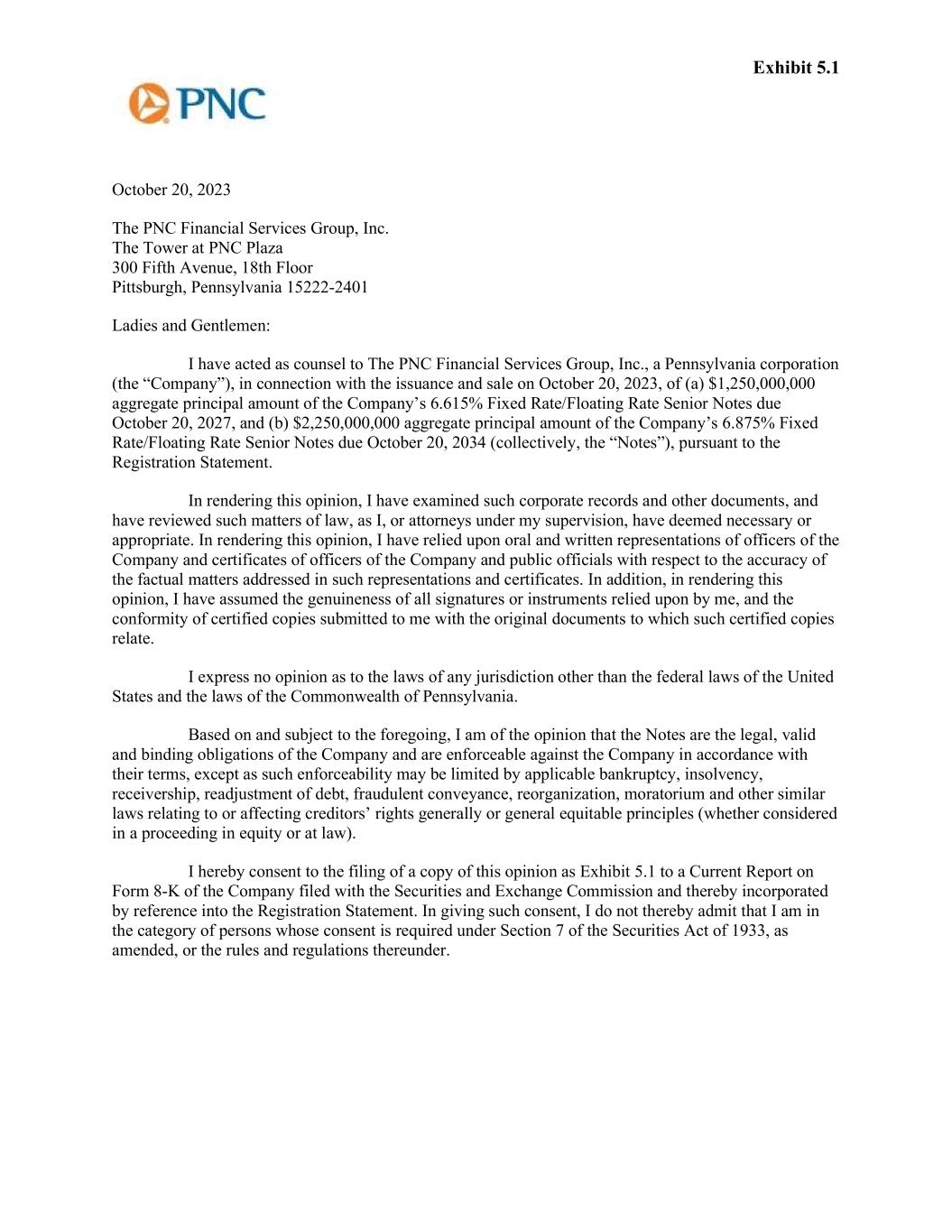Exhibit 5.1 October 20, 2023 The PNC Financial Services Group, Inc. The Tower at PNC Plaza 300 Fifth Avenue, 18th Floor Pittsburgh, Pennsylvania 15222-2401 Ladies and Gentlemen: I have acted as counsel to The PNC Financial Services Group, Inc., a Pennsylvania corporation (the “Company”), in connection with the issuance and sale on October 20, 2023, of (a) $1,250,000,000 aggregate principal amount of the Company’s 6.615% Fixed Rate/Floating Rate Senior Notes due October 20, 2027, and (b) $2,250,000,000 aggregate principal amount of the Company’s 6.875% Fixed Rate/Floating Rate Senior Notes due October 20, 2034 (collectively, the “Notes”), pursuant to the Registration Statement. In rendering this opinion, I have examined such corporate records and other documents, and have reviewed such matters of law, as I, or attorneys under my supervision, have deemed necessary or appropriate. In rendering this opinion, I have relied upon oral and written representations of officers of the Company and certificates of officers of the Company and public officials with respect to the accuracy of the factual matters addressed in such representations and certificates. In addition, in rendering this opinion, I have assumed the genuineness of all signatures or instruments relied upon by me, and the conformity of certified copies submitted to me with the original documents to which such certified copies relate. I express no opinion as to the laws of any jurisdiction other than the federal laws of the United States and the laws of the Commonwealth of Pennsylvania. Based on and subject to the foregoing, I am of the opinion that the Notes are the legal, valid and binding obligations of the Company and are enforceable against the Company in accordance with their terms, except as such enforceability may be limited by applicable bankruptcy, insolvency, receivership, readjustment of debt, fraudulent conveyance, reorganization, moratorium and other similar laws relating to or affecting creditors’ rights generally or general equitable principles (whether considered in a proceeding in equity or at law). I hereby consent to the filing of a copy of this opinion as Exhibit 5.1 to a Current Report on Form 8-K of the Company filed with the Securities and Exchange Commission and thereby incorporated by reference into the Registration Statement. In giving such consent, I do not thereby admit that I am in the category of persons whose consent is required under Section 7 of the Securities Act of 1933, as amended, or the rules and regulations thereunder.