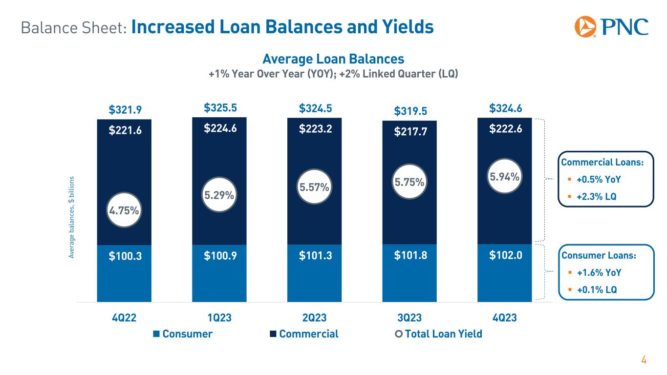 Balance Sheet: Grew LQ Loans, Deposits and TBV; AOCI Improved 3 4Q23 vs. 3Q23 4Q23 vs. 4Q22 Average balances, $ billions 4Q23 $ Change % Change $ Change % Change Total loans $324.6 $5.1 2% $2.7 1% Investment securities $137.4 ($2.3) (2%) ($5.5) (4%) Federal Reserve Bank (FRB) balances $42.2 $4.3 11% $12.2 41% Deposits $423.9 $1.4 - ($11.0) (3%) Borrowed funds $72.9 $5.4 8% $13.7 23% Common shareholders’ equity $42.6 $0.5 1% $3.2 8% Period End 4Q23 3Q23 4Q23 vs. 3Q23 4Q22 4Q23 vs. 4Q22 Basel III CET1 capital ratio 9.9% 9.8% 10 bps 9.1% 80 bps AOCI ($ in billions) ($7.7) ($10.3) 25% ($10.2) 24% Tangible book value per common share (TBV) (non-GAAP) $85. 08 $78.16 9% $72.12 18% − LQ represents linked quarter. − AOCI represents accumulated other comprehensive income. − Tangible book value per common share (non-GAAP) – See Reconciliation in the Appendix.
