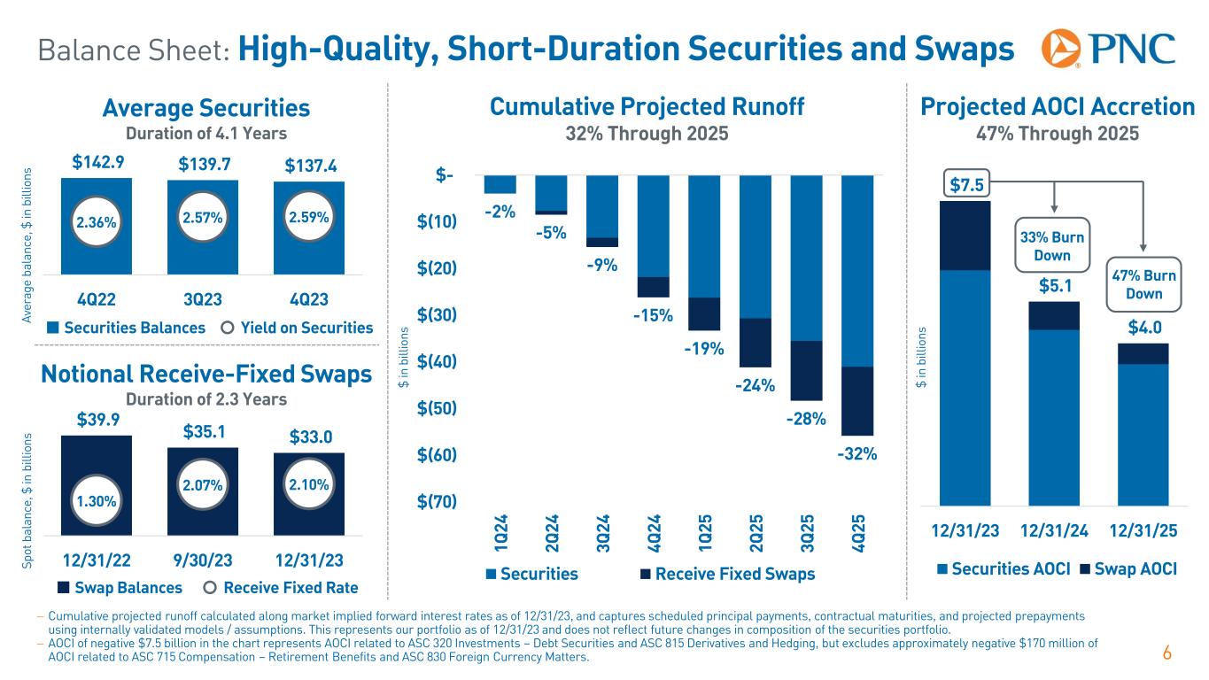 1.07% 2.26% 2.48% 4Q22 3Q23 4Q23 Balance Sheet: Strong and Stable Deposit Base 5 − IB Deposits represent interest-bearing deposits, and NIB Deposits represent noninterest-bearing deposits. − Cumulative deposit beta is calculated as the increase in the rate paid on interest-bearing deposits (excluding time deposits) at each period presented divided by the incremental increase in the Federal Reserve rate since February 2022. PNC’s Deposit Mix Shift Driven by Commercial Deposits 4Q22 3Q23 4Q23 4Q22 3Q23 4Q23 Consumer Commercial Consolidated IB DepositsNIB Deposits IB DepositsNIB Deposits $219 $217 $216 $205 $435 $424 Av er ag e ba la nc e, $ in b ill io ns Forecasted Cumulative Deposit Beta $423 $218 $207 Average Rate Paid on IB Deposits 44% 44% 12/31/23 45% 3/31/24 Jan. 2024 ExpectationActualOct. 2023 Expectation 51% 49% 42% 58% 40% 60% 10% 90% 10% 90% 10% 90% 31% 69% 26% 74% 25% 75% Historical Forecast ▪ First Fed rate cut expected in mid-2024 ▪ Rate paid anticipated to decline with rate cuts