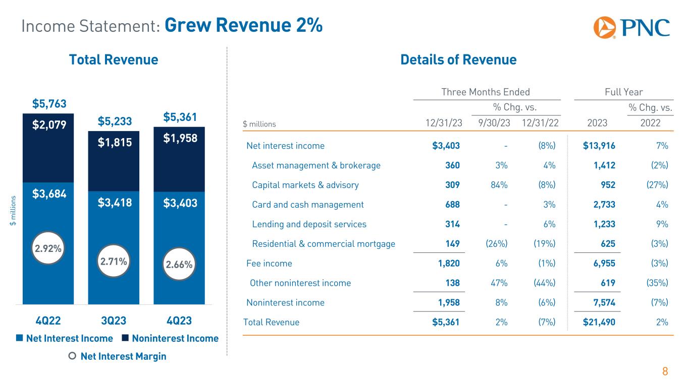Income Statement: Record Full Year Revenue 7 − Core noninterest expense (non-GAAP) – See Reconciliation in the Appendix. Core noninterest expense excludes the $515 million pre-tax impact of the FDIC's special assessment related to the closures of SVB and Signature Bank as well as $150 million pre-tax workforce reduction charges incurred in the fourth quarter of 2023. − Pretax, pre-provision earnings, as adjusted (non-GAAP) – See Reconciliation in the Appendix. Adjusted Operating Leverage (non-GAAP) – See Reconciliation in the Appendix. Adjusted Diluted EPS (non- GAAP) – See Reconciliation in Appendix. − Net interest margin is calculated using taxable-equivalent net interest income, a non-GAAP measure, see Reconciliation in the Appendix. Three Months Ended Full Year % Change vs. % Change vs. $ in millions 12/31/23 9/30/23 12/31/22 2023 2022 Net interest income $3,403 - (8%) $13,916 7% Noninterest income 1,958 8% (6%) 7,574 (7%) Total revenue 5,361 2% (7%) 21,490 2% Noninterest expense 4,074 26% 17% 14,012 6% Core noninterest expense (non-GAAP) 3,409 5% (2%) 13,347 1% Pretax, pre-provision earnings, as adjusted (non-GAAP) $1,952 (2%) (15%) $8,143 2% Provision for credit losses $232 80% (43%) $742 56% Income taxes $172 (40%) (48%) $1,089 (20%) Net income $883 (44%) (43%) $5,647 (8%) 4Q23 3Q23 4Q22 2023 2022 Noninterest income to total revenue 37% 35% 36% 35% 38% Net interest margin (non-GAAP) 2.66% 2.71% 2.92% 2.76% 2.65% Diluted EPS $1.85 $3.60 $3.47 $12.79 $13.85 Adjusted Diluted EPS (non-GAAP) $3.16 N/A N/A $14.10 N/A Adjusted Operating Leverage (non-GAAP): +41 bps