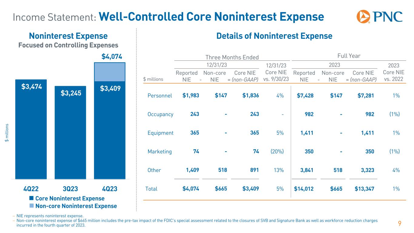 Income Statement: Grew Revenue 2% 8 $ m ill io ns Total Revenue $3,684 $3,418 $3,403 $2,079 $1,815 $1,958 $5,763 $5,233 $5,361 2.92% 2.71% 2.66% 4Q22 3Q23 4Q23 Details of Revenue Net Interest Income Net Interest Margin Noninterest Income Three Months Ended Full Year % Chg. vs. % Chg. vs. $ millions 12/31/23 9/30/23 12/31/22 2023 2022 Net interest income $3,403 - (8%) $13,916 7% Asset management & brokerage 360 3% 4% 1,412 (2%) Capital markets & advisory 309 84% (8%) 952 (27%) Card and cash management 688 - 3% 2,733 4% Lending and deposit services 314 - 6% 1,233 9% Residential & commercial mortgage 149 (26%) (19%) 625 (3%) Fee income 1,820 6% (1%) 6,955 (3%) Other noninterest income 138 47% (44%) 619 (35%) Noninterest income 1,958 8% (6%) 7,574 (7%) Total Revenue $5,361 2% (7%) $21,490 2%