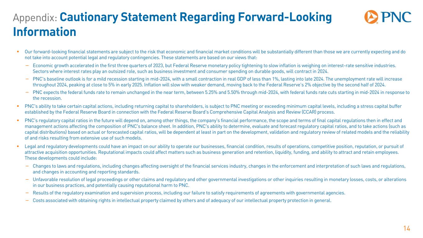 Appendix: Cautionary Statement Regarding Forward-Looking Information 14  Our forward-looking financial statements are subject to the risk that economic and financial market conditions will be substantially different than those we are currently expecting and do not take into account potential legal and regulatory contingencies. These statements are based on our views that: − Economic growth accelerated in the first three quarters of 2023, but Federal Reserve monetary policy tightening to slow inflation is weighing on interest-rate sensitive industries. Sectors where interest rates play an outsized role, such as business investment and consumer spending on durable goods, will contract in 2024. − PNC’s baseline outlook is for a mild recession starting in mid-2024, with a small contraction in real GDP of less than 1%, lasting into late 2024. The unemployment rate will increase throughout 2024, peaking at close to 5% in early 2025. Inflation will slow with weaker demand, moving back to the Federal Reserve's 2% objective by the second half of 2024. − PNC expects the federal funds rate to remain unchanged in the near term, between 5.25% and 5.50% through mid-2024, with federal funds rate cuts starting in mid-2024 in response to the recession.  PNC’s ability to take certain capital actions, including returning capital to shareholders, is subject to PNC meeting or exceeding minimum capital levels, including a stress capital buffer established by the Federal Reserve Board in connection with the Federal Reserve Board’s Comprehensive Capital Analysis and Review (CCAR) process.  PNC’s regulatory capital ratios in the future will depend on, among other things, the company’s financial performance, the scope and terms of final capital regulations then in effect and management actions affecting the composition of PNC’s balance sheet. In addition, PNC’s ability to determine, evaluate and forecast regulatory capital ratios, and to take actions (such as capital distributions) based on actual or forecasted capital ratios, will be dependent at least in part on the development, validation and regulatory review of related models and the reliability of and risks resulting from extensive use of such models.  Legal and regulatory developments could have an impact on our ability to operate our businesses, financial condition, results of operations, competitive position, reputation, or pursuit of attractive acquisition opportunities. Reputational impacts could affect matters such as business generation and retention, liquidity, funding, and ability to attract and retain employees. These developments could include: − Changes to laws and regulations, including changes affecting oversight of the financial services industry, changes in the enforcement and interpretation of such laws and regulations, and changes in accounting and reporting standards. − Unfavorable resolution of legal proceedings or other claims and regulatory and other governmental investigations or other inquiries resulting in monetary losses, costs, or alterations in our business practices, and potentially causing reputational harm to PNC. − Results of the regulatory examination and supervision process, including our failure to satisfy requirements of agreements with governmental agencies. − Costs associated with obtaining rights in intellectual property claimed by others and of adequacy of our intellectual property protection in general.