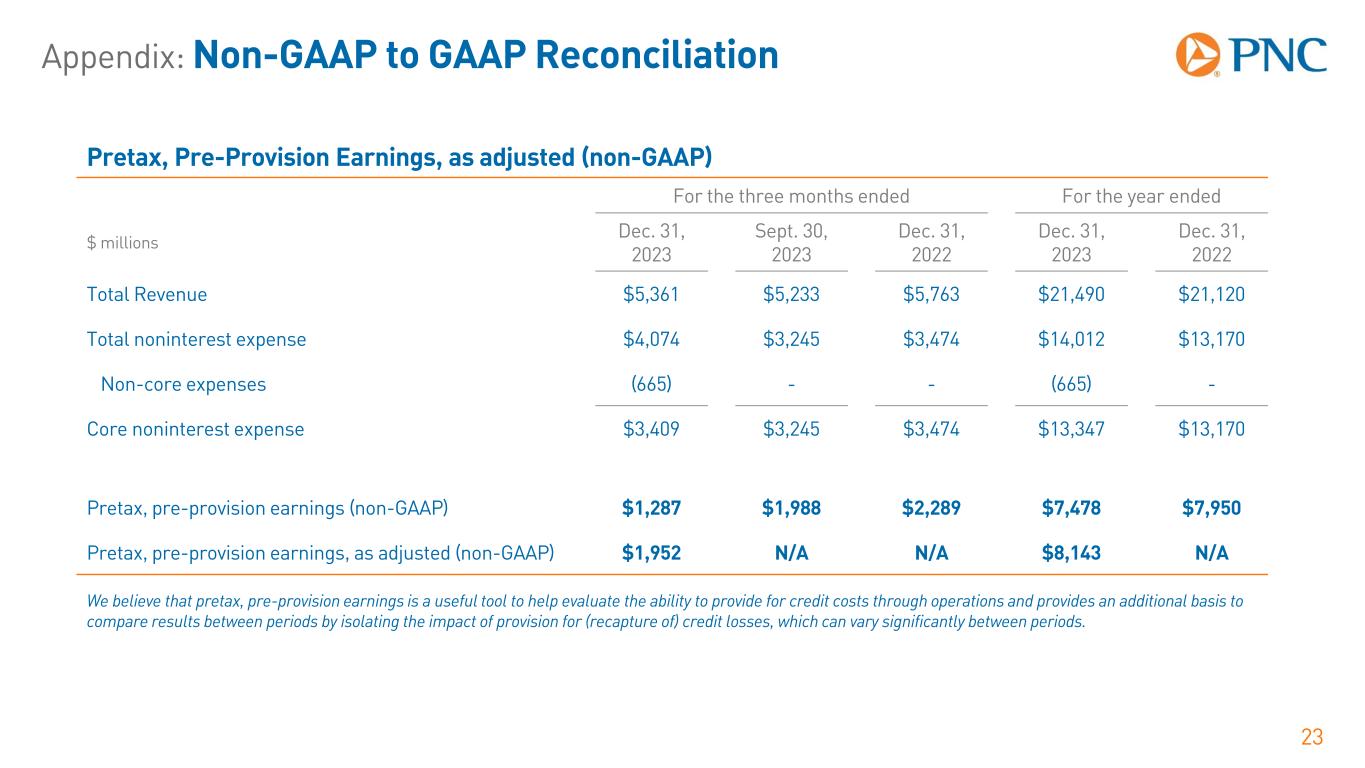 Appendix: Non-GAAP to GAAP Reconciliation 22 Adjusted Diluted Earnings per Share (non-GAAP) For the three months ended For the year ended $ millions Dec. 31, 2023 Per Common Share Dec. 31, 2023 Per Common Share Net income attributable to common shareholders $744 $5,153 Dividend and undistributed earnings allocated to nonvested restricted shares (4) (27) Net Income attributable to diluted common shareholders 740 $1.85 5,126 $12.79 Total noninterest expense adjustments after tax 525 $1.31 525 $1.31 Adjusted net income attributable to diluted common shareholders (non-GAAP) $1,265 $3.16 $5,651 $14.10 Average diluted common shares outstanding 401 401 Note: Total noninterest expense adjustments are taxed at the statutory rate of 21%. We believe this non-GAAP measure serves as a useful tool in understanding PNC's results by providing greater comparability between periods, as well as demonstrating the effect of significant items.