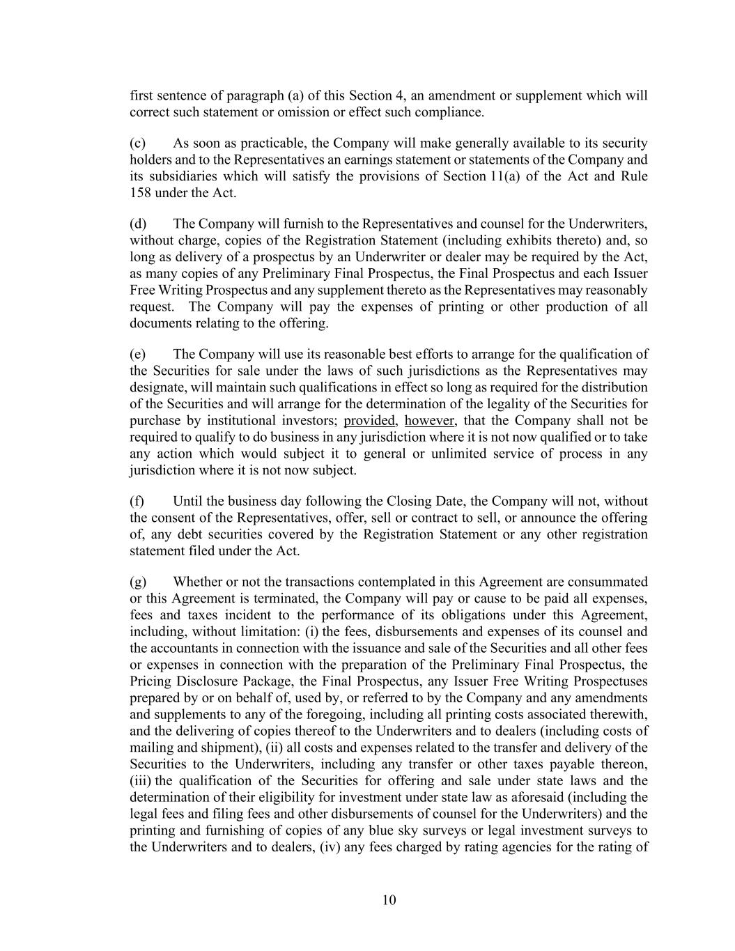 10 first sentence of paragraph (a) of this Section 4, an amendment or supplement which will correct such statement or omission or effect such compliance. (c) As soon as practicable, the Company will make generally available to its security holders and to the Representatives an earnings statement or statements of the Company and its subsidiaries which will satisfy the provisions of Section 11(a) of the Act and Rule 158 under the Act. (d) The Company will furnish to the Representatives and counsel for the Underwriters, without charge, copies of the Registration Statement (including exhibits thereto) and, so long as delivery of a prospectus by an Underwriter or dealer may be required by the Act, as many copies of any Preliminary Final Prospectus, the Final Prospectus and each Issuer Free Writing Prospectus and any supplement thereto as the Representatives may reasonably request. The Company will pay the expenses of printing or other production of all documents relating to the offering. (e) The Company will use its reasonable best efforts to arrange for the qualification of the Securities for sale under the laws of such jurisdictions as the Representatives may designate, will maintain such qualifications in effect so long as required for the distribution of the Securities and will arrange for the determination of the legality of the Securities for purchase by institutional investors; provided, however, that the Company shall not be required to qualify to do business in any jurisdiction where it is not now qualified or to take any action which would subject it to general or unlimited service of process in any jurisdiction where it is not now subject. (f) Until the business day following the Closing Date, the Company will not, without the consent of the Representatives, offer, sell or contract to sell, or announce the offering of, any debt securities covered by the Registration Statement or any other registration statement filed under the Act. (g) Whether or not the transactions contemplated in this Agreement are consummated or this Agreement is terminated, the Company will pay or cause to be paid all expenses, fees and taxes incident to the performance of its obligations under this Agreement, including, without limitation: (i) the fees, disbursements and expenses of its counsel and the accountants in connection with the issuance and sale of the Securities and all other fees or expenses in connection with the preparation of the Preliminary Final Prospectus, the Pricing Disclosure Package, the Final Prospectus, any Issuer Free Writing Prospectuses prepared by or on behalf of, used by, or referred to by the Company and any amendments and supplements to any of the foregoing, including all printing costs associated therewith, and the delivering of copies thereof to the Underwriters and to dealers (including costs of mailing and shipment), (ii) all costs and expenses related to the transfer and delivery of the Securities to the Underwriters, including any transfer or other taxes payable thereon, (iii) the qualification of the Securities for offering and sale under state laws and the determination of their eligibility for investment under state law as aforesaid (including the legal fees and filing fees and other disbursements of counsel for the Underwriters) and the printing and furnishing of copies of any blue sky surveys or legal investment surveys to the Underwriters and to dealers, (iv) any fees charged by rating agencies for the rating of