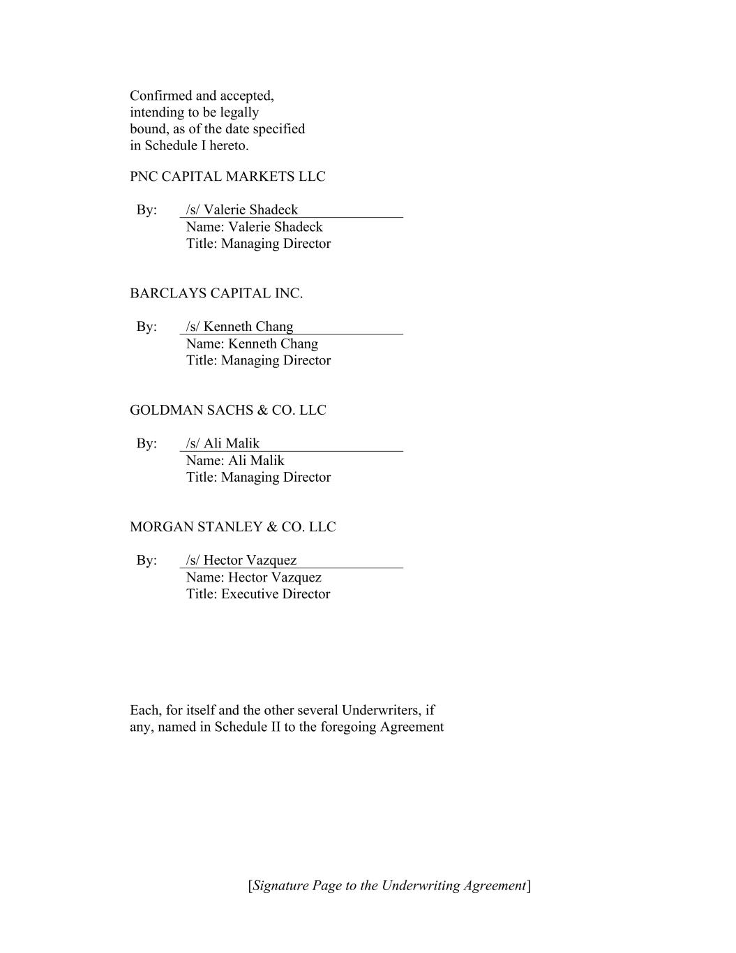 [Signature Page to the Underwriting Agreement] Confirmed and accepted, intending to be legally bound, as of the date specified in Schedule I hereto. PNC CAPITAL MARKETS LLC By: /s/ Valerie Shadeck Name: Valerie Shadeck Title: Managing Director BARCLAYS CAPITAL INC. By: /s/ Kenneth Chang Name: Kenneth Chang Title: Managing Director GOLDMAN SACHS & CO. LLC By: /s/ Ali Malik Name: Ali Malik Title: Managing Director MORGAN STANLEY & CO. LLC By: /s/ Hector Vazquez Name: Hector Vazquez Title: Executive Director Each, for itself and the other several Underwriters, if any, named in Schedule II to the foregoing Agreement