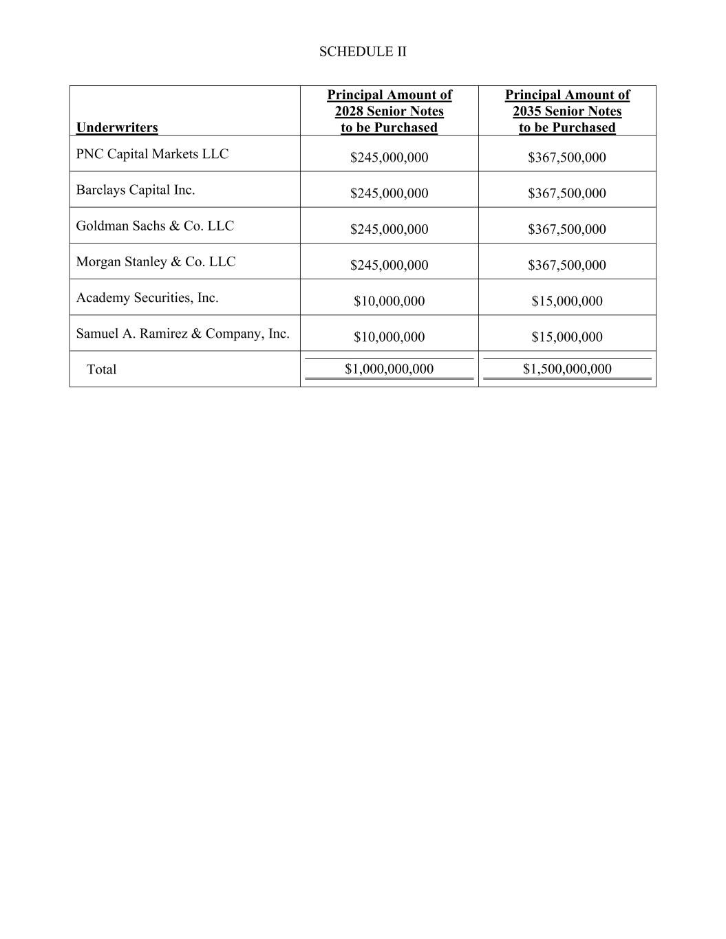 SCHEDULE II Underwriters Principal Amount of 2028 Senior Notes to be Purchased Principal Amount of 2035 Senior Notes to be Purchased PNC Capital Markets LLC $245,000,000 $367,500,000 Barclays Capital Inc. $245,000,000 $367,500,000 Goldman Sachs & Co. LLC $245,000,000 $367,500,000 Morgan Stanley & Co. LLC $245,000,000 $367,500,000 Academy Securities, Inc. $10,000,000 $15,000,000 Samuel A. Ramirez & Company, Inc. $10,000,000 $15,000,000 Total $1,000,000,000 $1,500,000,000