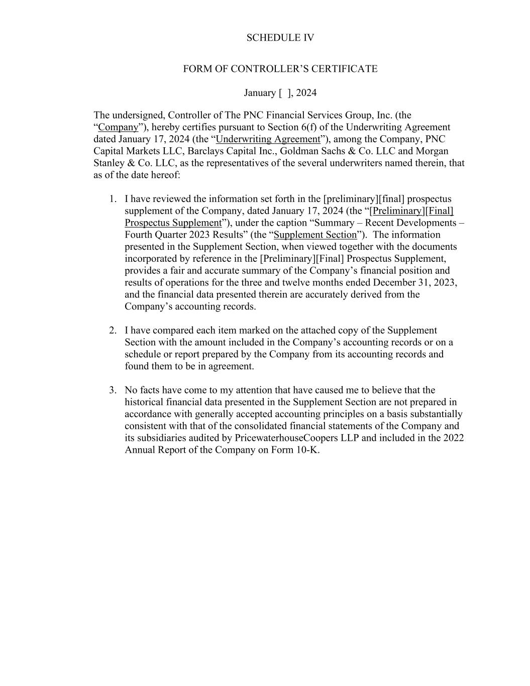 SCHEDULE IV FORM OF CONTROLLER’S CERTIFICATE January [ ], 2024 The undersigned, Controller of The PNC Financial Services Group, Inc. (the “Company”), hereby certifies pursuant to Section 6(f) of the Underwriting Agreement dated January 17, 2024 (the “Underwriting Agreement”), among the Company, PNC Capital Markets LLC, Barclays Capital Inc., Goldman Sachs & Co. LLC and Morgan Stanley & Co. LLC, as the representatives of the several underwriters named therein, that as of the date hereof: 1. I have reviewed the information set forth in the [preliminary][final] prospectus supplement of the Company, dated January 17, 2024 (the “[Preliminary][Final] Prospectus Supplement”), under the caption “Summary – Recent Developments – Fourth Quarter 2023 Results” (the “Supplement Section”). The information presented in the Supplement Section, when viewed together with the documents incorporated by reference in the [Preliminary][Final] Prospectus Supplement, provides a fair and accurate summary of the Company’s financial position and results of operations for the three and twelve months ended December 31, 2023, and the financial data presented therein are accurately derived from the Company’s accounting records. 2. I have compared each item marked on the attached copy of the Supplement Section with the amount included in the Company’s accounting records or on a schedule or report prepared by the Company from its accounting records and found them to be in agreement. 3. No facts have come to my attention that have caused me to believe that the historical financial data presented in the Supplement Section are not prepared in accordance with generally accepted accounting principles on a basis substantially consistent with that of the consolidated financial statements of the Company and its subsidiaries audited by PricewaterhouseCoopers LLP and included in the 2022 Annual Report of the Company on Form 10-K.