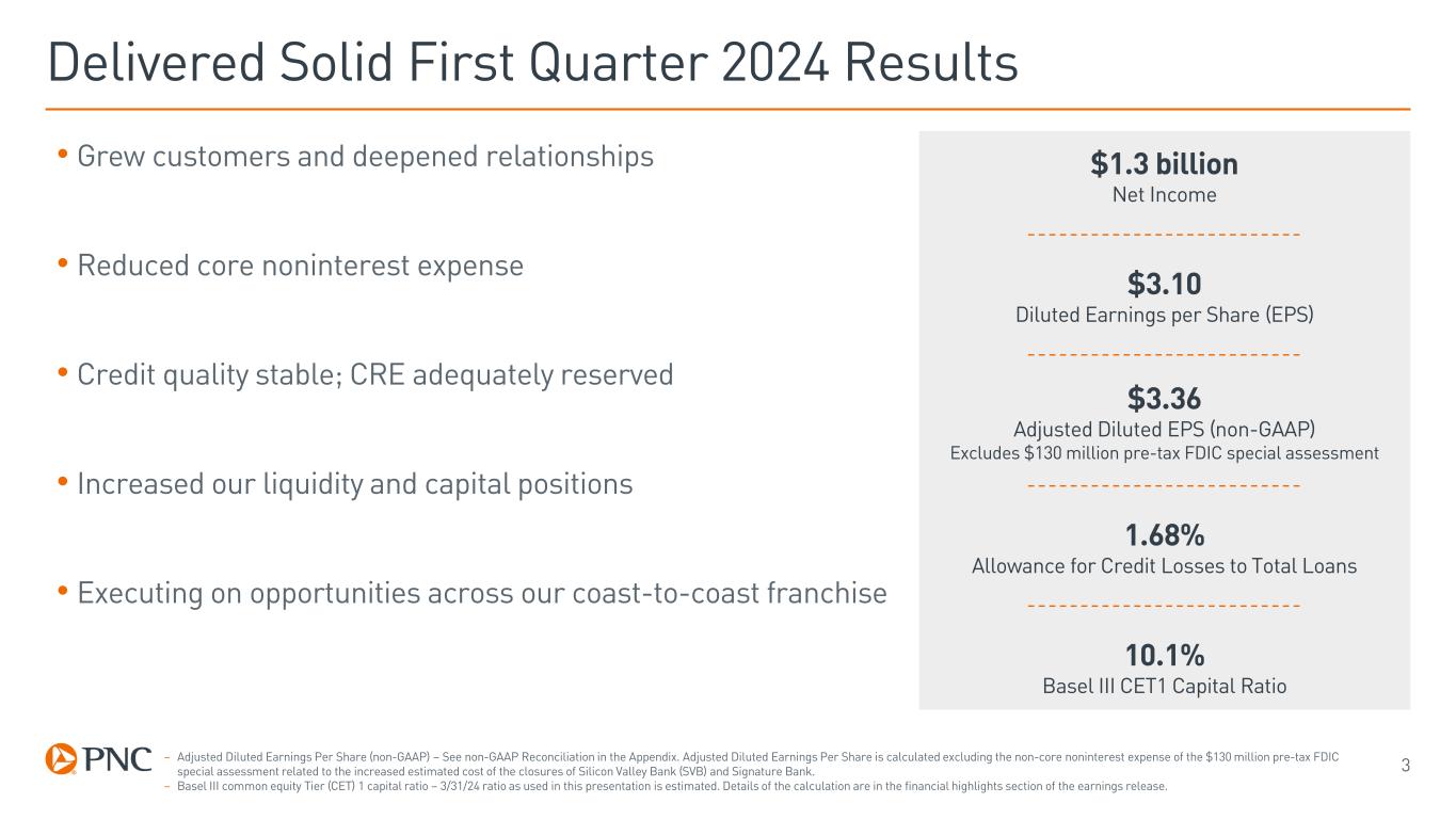 Regarding Forward-Looking and non-GAAP Financial Information Our earnings conference call presentation is not intended as a full business or financial review and should be viewed in the context of all of the information made available by PNC in its SEC filings and on our corporate website. The presentation contains forward-looking statements regarding our outlook for financial performance, such as earnings, revenues, expenses, tax rates, capital and liquidity levels and ratios, asset levels, asset quality, financial position, and other matters regarding or affecting PNC and its future business and operations, including sustainability strategy. Forward-looking statements are necessarily subject to numerous assumptions, risks and uncertainties, which change over time. The forward-looking statements in this presentation are qualified by the factors affecting forward-looking statements identified in the more detailed Cautionary Statement included in the Appendix. We provide greater detail regarding these as well as other factors in our 2023 Form 10-K, and our subsequent SEC filings. Our forward-looking statements may also be subject to risks and uncertainties including those we may discuss in this presentation or in our SEC filings. Future events or circumstances may change our outlook and may also affect the nature of the assumptions, risks and uncertainties to which our forward-looking statements are subject. Forward-looking statements in this presentation speak only as of the date of this presentation. We do not assume any duty and do not undertake any obligation to update those statements. Actual results or future events could differ, possibly materially, from those anticipated in forward-looking statements, as well as from historical performance. As a result, we caution against placing undue reliance on any forward-looking statements. We include non-GAAP financial information in this presentation. Reconciliations for such financial information may be found in our presentation, in these slides, including the Appendix, in other materials on our corporate website, and in our SEC filings. This information supplements our results as reported in accordance with GAAP and should not be viewed in isolation from, or as a substitute for, our GAAP results. We believe that this information and the related reconciliations may be useful to investors, analysts, regulators and others to help understand and evaluate our financial results, and with respect to adjusted metrics, because we believe they better reflect the ongoing financial results and trends of our businesses and increase comparability of period-to-period results. We may also use annualized, pro forma, estimated or third party numbers for illustrative or comparative purposes only. These may not reflect actual results. References to our corporate website are to www.pnc.com under “About Us - Investor Relations.” Our SEC filings are available both on our corporate website and on the SEC’s website at www.sec.gov. We include web addresses here as inactive textual references only. Information on these websites is not part of this presentation. 2 Cautionary Statement