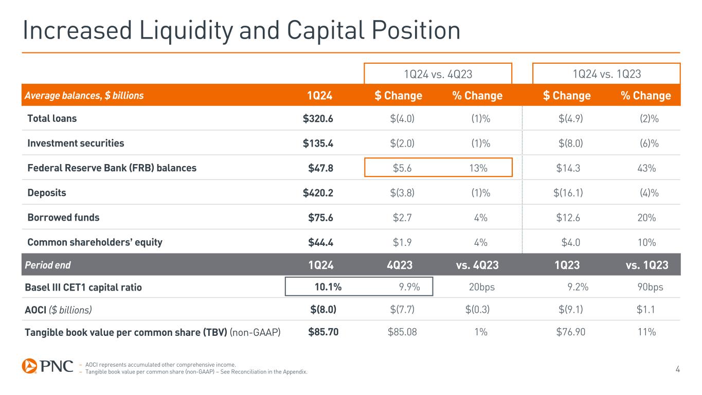 • Grew customers and deepened relationships • Reduced core noninterest expense • Credit quality stable; CRE adequately reserved • Increased our liquidity and capital positions • Executing on opportunities across our coast-to-coast franchise 3 Delivered Solid First Quarter 2024 Results $1.3 billion Net Income $3.10 Diluted Earnings per Share (EPS) $3.36 Adjusted Diluted EPS (non-GAAP) Excludes $130 million pre-tax FDIC special assessment 1.68% Allowance for Credit Losses to Total Loans 10.1% Basel III CET1 Capital Ratio – Adjusted Diluted Earnings Per Share (non-GAAP) – See non-GAAP Reconciliation in the Appendix. Adjusted Diluted Earnings Per Share is calculated excluding the non-core noninterest expense of the $130 million pre-tax FDIC special assessment related to the increased estimated cost of the closures of Silicon Valley Bank (SVB) and Signature Bank. – Basel III common equity Tier (CET) 1 capital ratio – 3/31/24 ratio as used in this presentation is estimated. Details of the calculation are in the financial highlights section of the earnings release.