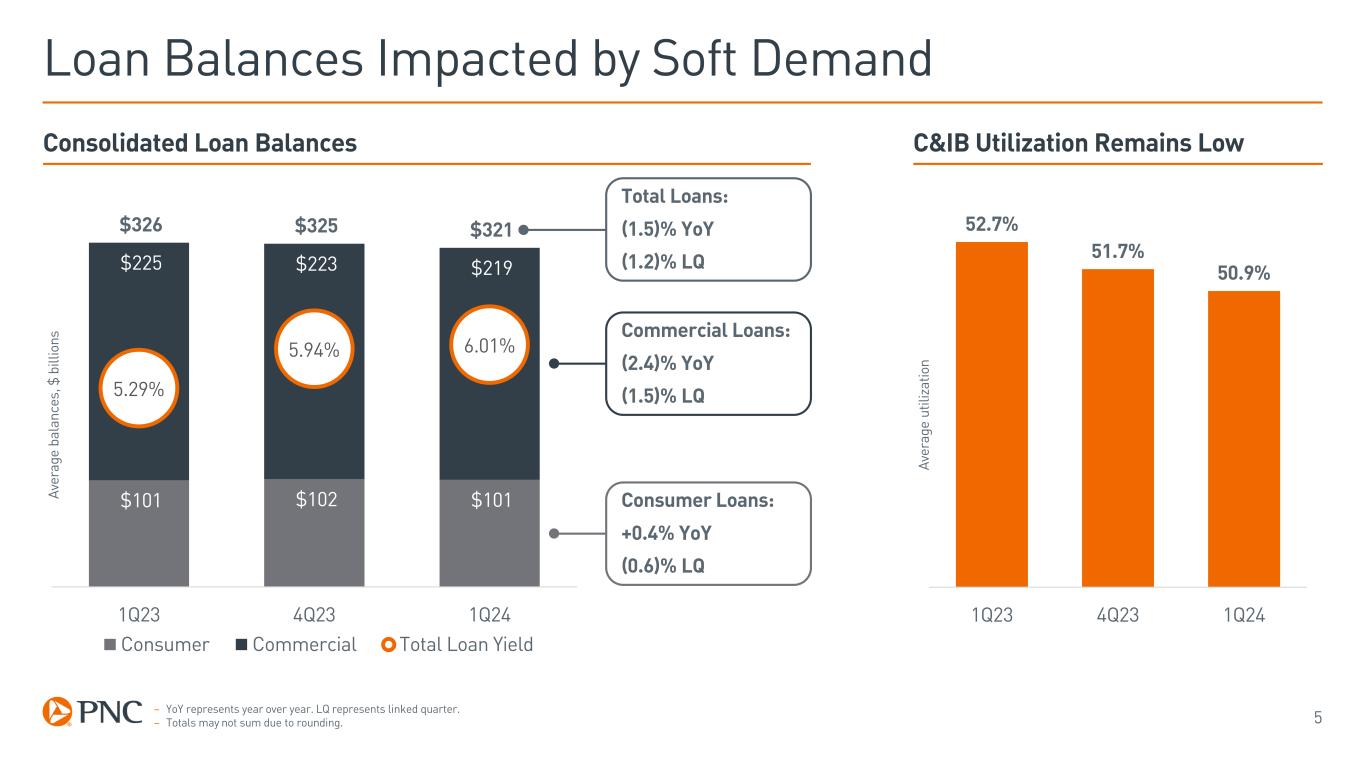 4 Increased Liquidity and Capital Position 1Q24 vs. 4Q23 1Q24 vs. 1Q23 Average balances, $ billions 1Q24 $ Change % Change $ Change % Change Total loans $320.6 $(4.0) (1)% $(4.9) (2)% Investment securities $135.4 $(2.0) (1)% $(8.0) (6)% Federal Reserve Bank (FRB) balances $47.8 $5.6 13% $14.3 43% Deposits $420.2 $(3.8) (1)% $(16.1) (4)% Borrowed funds $75.6 $2.7 4% $12.6 20% Common shareholders’ equity $44.4 $1.9 4% $4.0 10% Period end 1Q24 4Q23 vs. 4Q23 1Q23 vs. 1Q23 Basel III CET1 capital ratio 10.1% 9.9% 20bps 9.2% 90bps AOCI ($ billions) $(8.0) $(7.7) $(0.3) $(9.1) $1.1 Tangible book value per common share (TBV) (non-GAAP) $85.70 $85.08 1% $76.90 11% – AOCI represents accumulated other comprehensive income. – Tangible book value per common share (non-GAAP) – See Reconciliation in the Appendix.