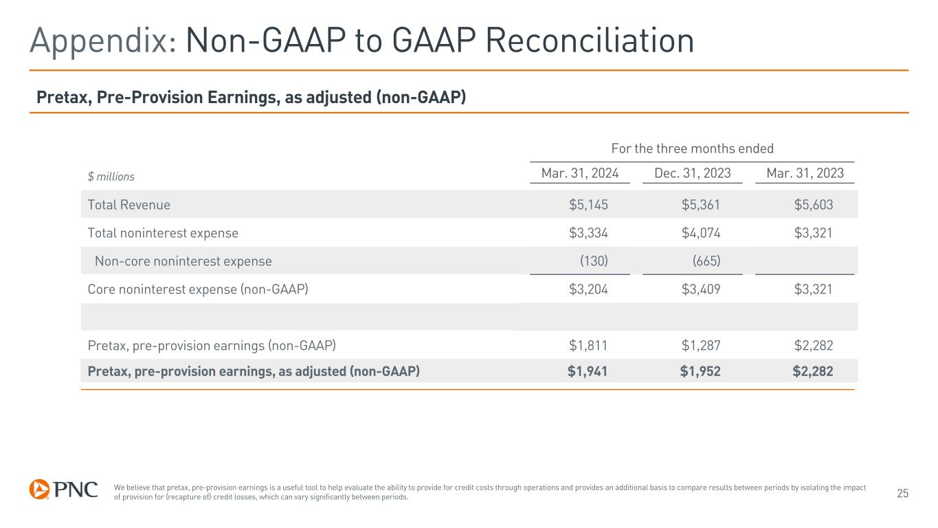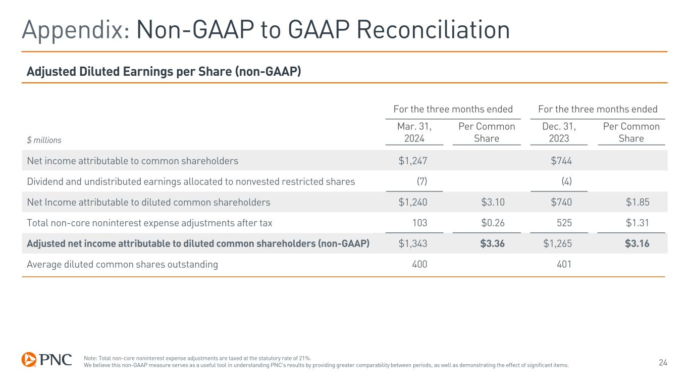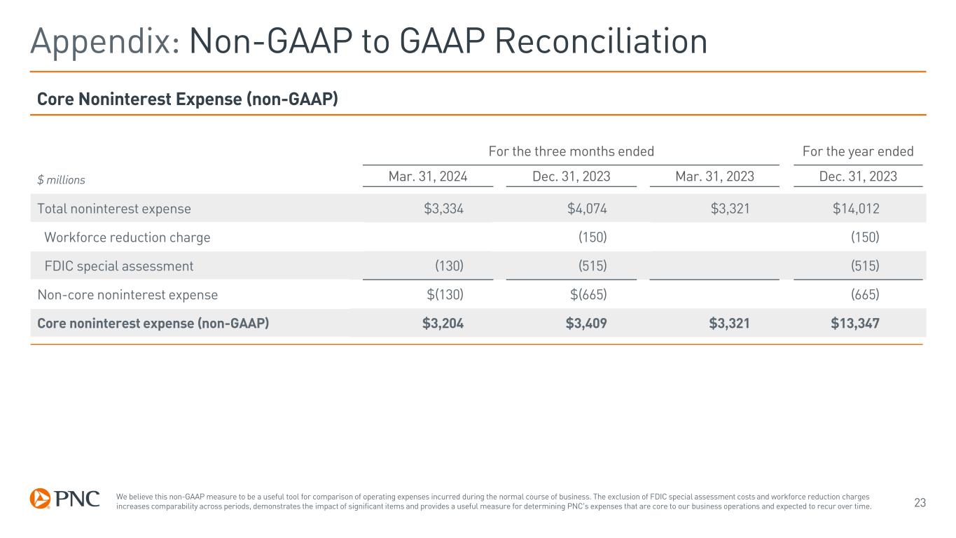 Appendix: Non-GAAP to GAAP Reconciliation 23 We believe this non-GAAP measure to be a useful tool for comparison of operating expenses incurred during the normal course of business. The exclusion of FDIC special assessment costs and workforce reduction charges increases comparability across periods, demonstrates the impact of significant items and provides a useful measure for determining PNC’s expenses that are core to our business operations and expected to recur over time. Core Noninterest Expense (non-GAAP) For the three months ended For the year ended $ millions Mar. 31, 2024 Dec. 31, 2023 Mar. 31, 2023 Dec. 31, 2023 Total noninterest expense $3,334 $4,074 $3,321 $14,012 Workforce reduction charge (150) (150) FDIC special assessment (130) (515) (515) Non-core noninterest expense $(130) $(665) (665) Core noninterest expense (non-GAAP) $3,204 $3,409 $3,321 $13,347