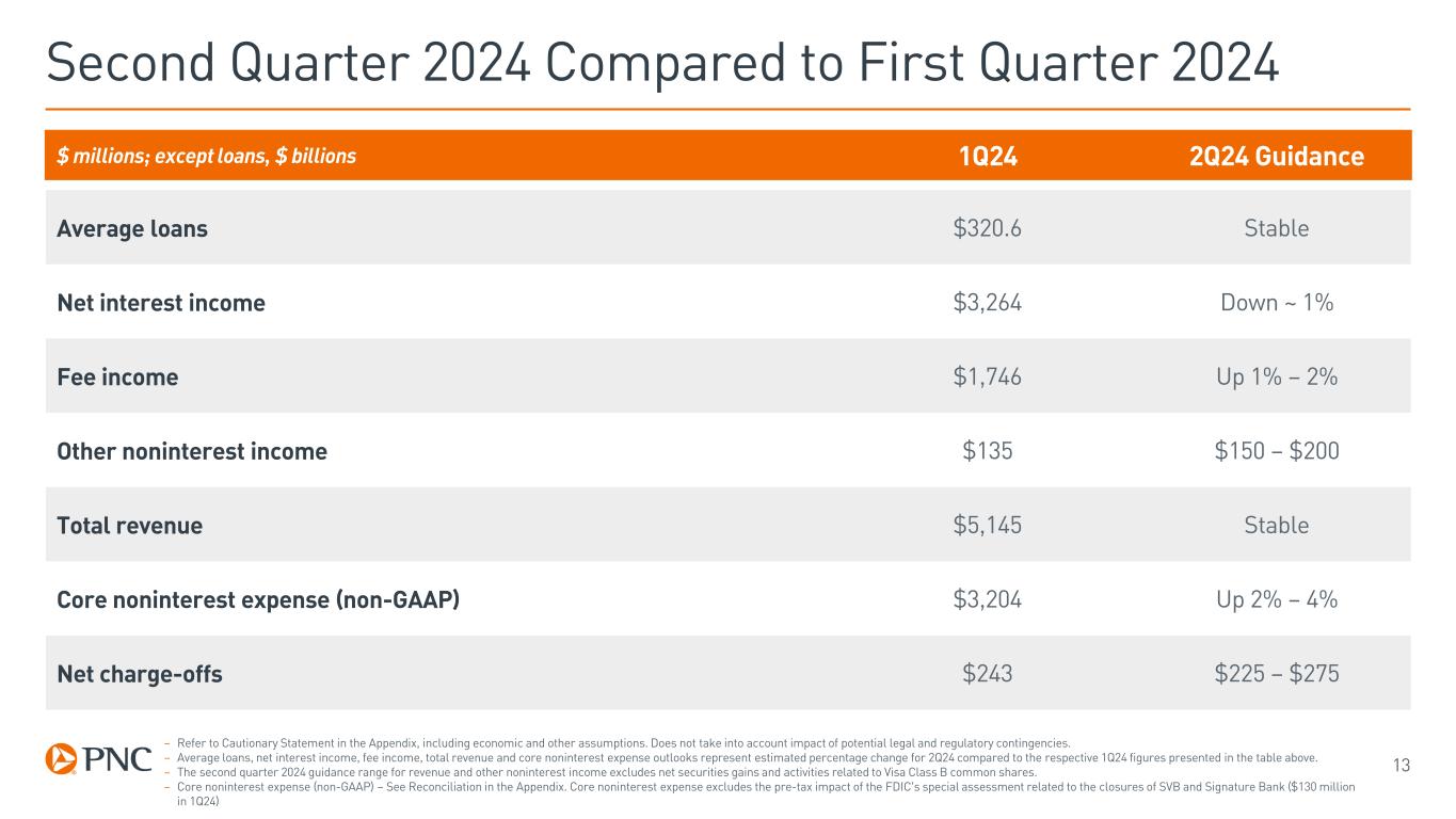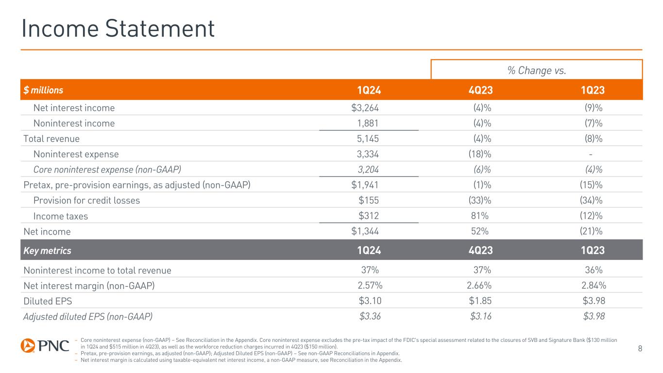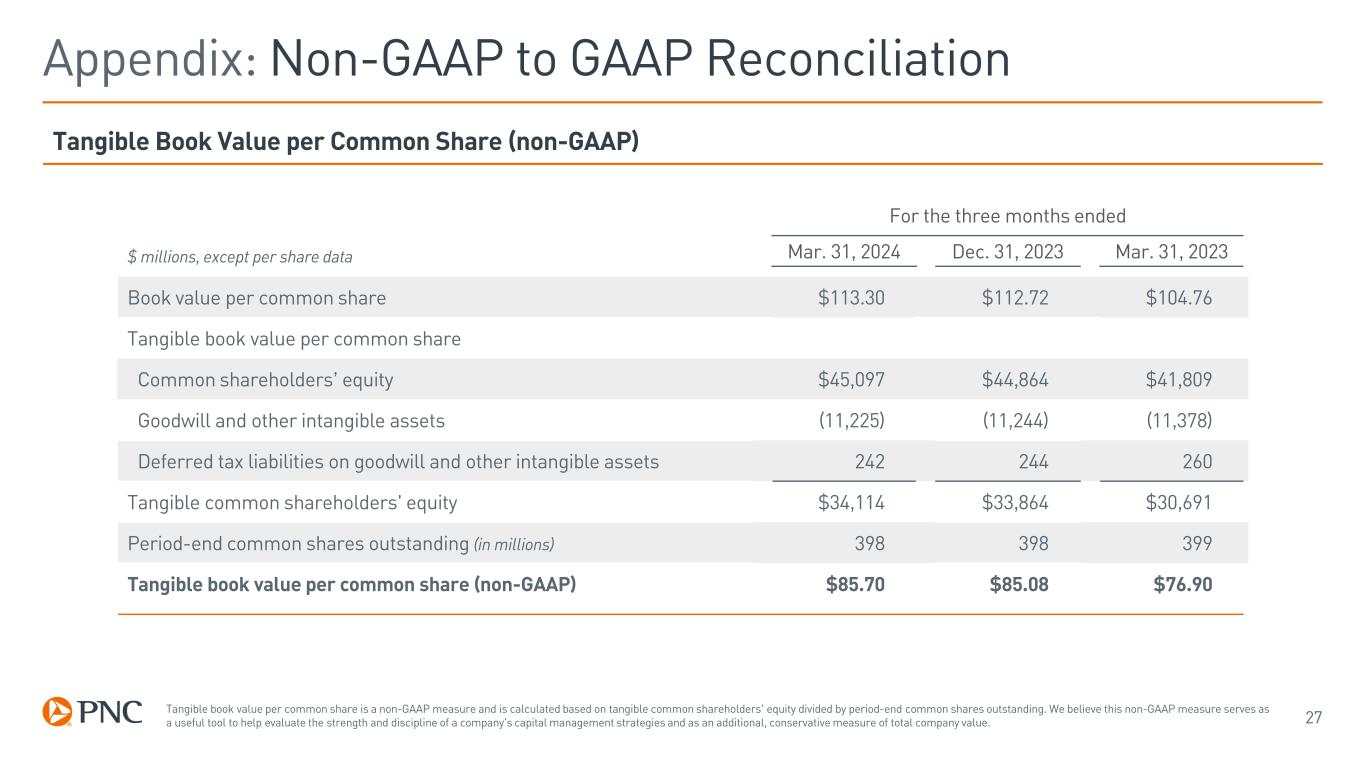 Appendix: Non-GAAP to GAAP Reconciliation 23 We believe this non-GAAP measure to be a useful tool for comparison of operating expenses incurred during the normal course of business. The exclusion of FDIC special assessment costs and workforce reduction charges increases comparability across periods, demonstrates the impact of significant items and provides a useful measure for determining PNC’s expenses that are core to our business operations and expected to recur over time. Core Noninterest Expense (non-GAAP) For the three months ended For the year ended $ millions Mar. 31, 2024 Dec. 31, 2023 Mar. 31, 2023 Dec. 31, 2023 Total noninterest expense $3,334 $4,074 $3,321 $14,012 Workforce reduction charge (150) (150) FDIC special assessment (130) (515) (515) Non-core noninterest expense $(130) $(665) (665) Core noninterest expense (non-GAAP) $3,204 $3,409 $3,321 $13,347