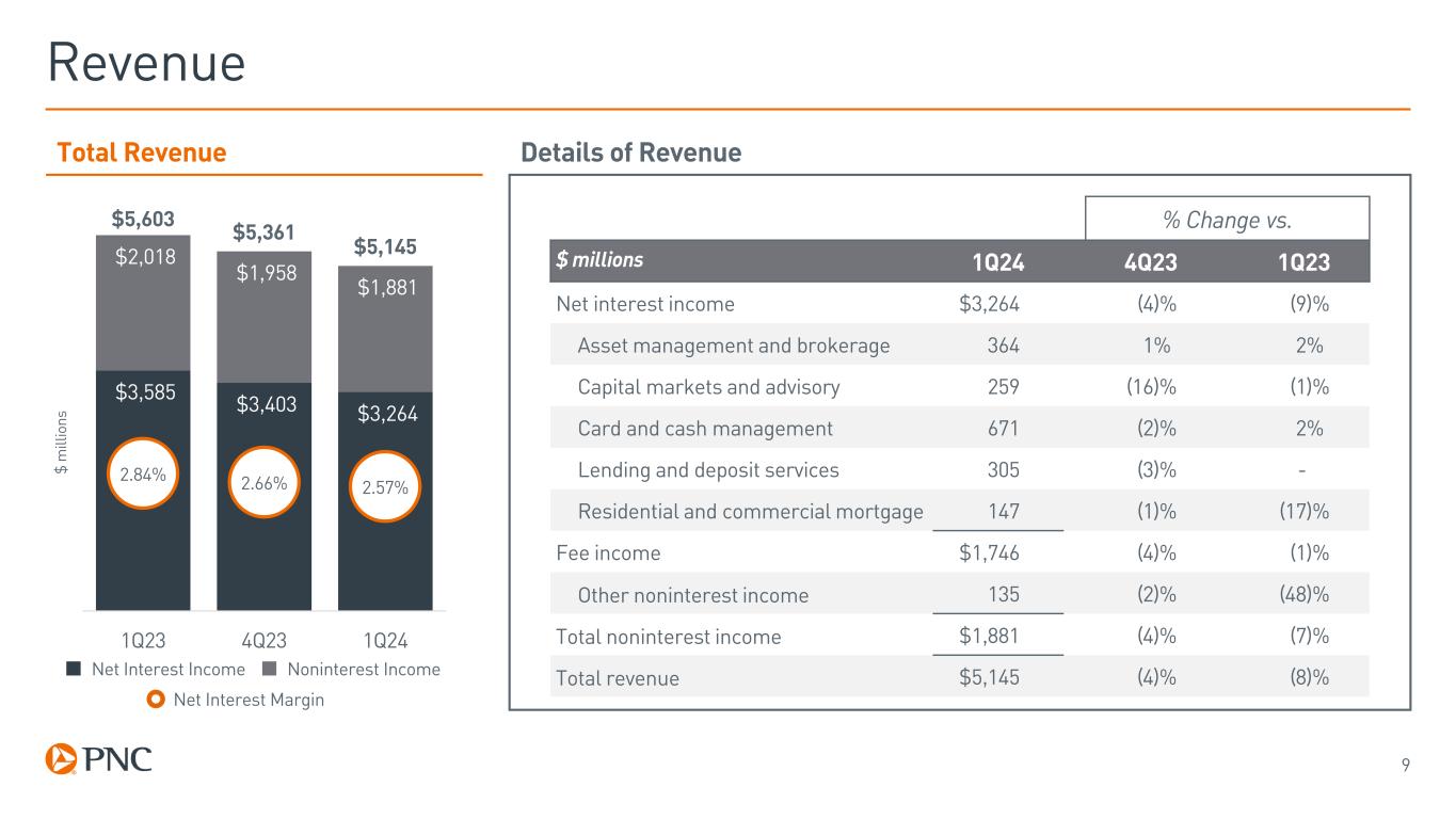 8 Income Statement % Change vs. $ millions 1Q24 4Q23 1Q23 Net interest income $3,264 (4)% (9)% Noninterest income 1,881 (4)% (7)% Total revenue 5,145 (4)% (8)% Noninterest expense 3,334 (18)% - Core noninterest expense (non-GAAP) 3,204 (6)% (4)% Pretax, pre-provision earnings, as adjusted (non-GAAP) $1,941 (1)% (15)% Provision for credit losses $155 (33)% (34)% Income taxes $312 81% (12)% Net income $1,344 52% (21)% Key metrics 1Q24 4Q23 1Q23 Noninterest income to total revenue 37% 37% 36% Net interest margin (non-GAAP) 2.57% 2.66% 2.84% Diluted EPS $3.10 $1.85 $3.98 Adjusted diluted EPS (non-GAAP) $3.36 $3.16 $3.98 – Core noninterest expense (non-GAAP) – See Reconciliation in the Appendix. Core noninterest expense excludes the pre-tax impact of the FDIC’s special assessment related to the closures of SVB and Signature Bank ($130 million in 1Q24 and $515 million in 4Q23), as well as the workforce reduction charges incurred in 4Q23 ($150 million). – Pretax, pre-provision earnings, as adjusted (non-GAAP); Adjusted Diluted EPS (non-GAAP) – See non-GAAP Reconciliations in Appendix. – Net interest margin is calculated using taxable-equivalent net interest income, a non-GAAP measure, see Reconciliation in the Appendix.