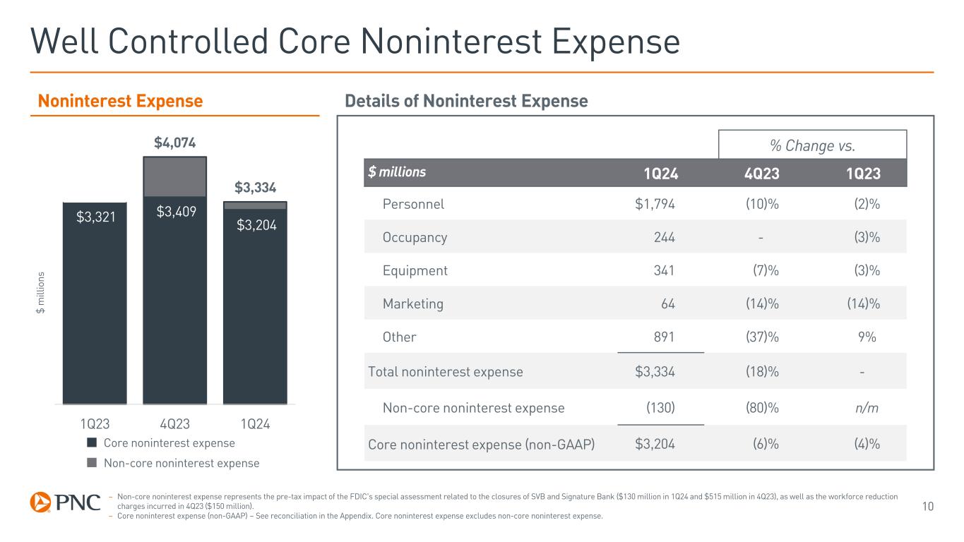 9 Revenue $3,585 $3,403 $3,264 $2,018 $1,958 $1,881 $5,603 $5,361 $5,145 2.84% 2.66% 2.57% 1Q23 4Q23 1Q24 Net Interest Margin Net Interest Income Noninterest Income Details of Revenue % Change vs. $ millions 1Q24 4Q23 1Q23 Net interest income $3,264 (4)% (9)% Asset management and brokerage 364 1% 2% Capital markets and advisory 259 (16)% (1)% Card and cash management 671 (2)% 2% Lending and deposit services 305 (3)% - Residential and commercial mortgage 147 (1)% (17)% Fee income $1,746 (4)% (1)% Other noninterest income 135 (2)% (48)% Total noninterest income $1,881 (4)% (7)% Total revenue $5,145 (4)% (8)% Total Revenue $ m ill io ns