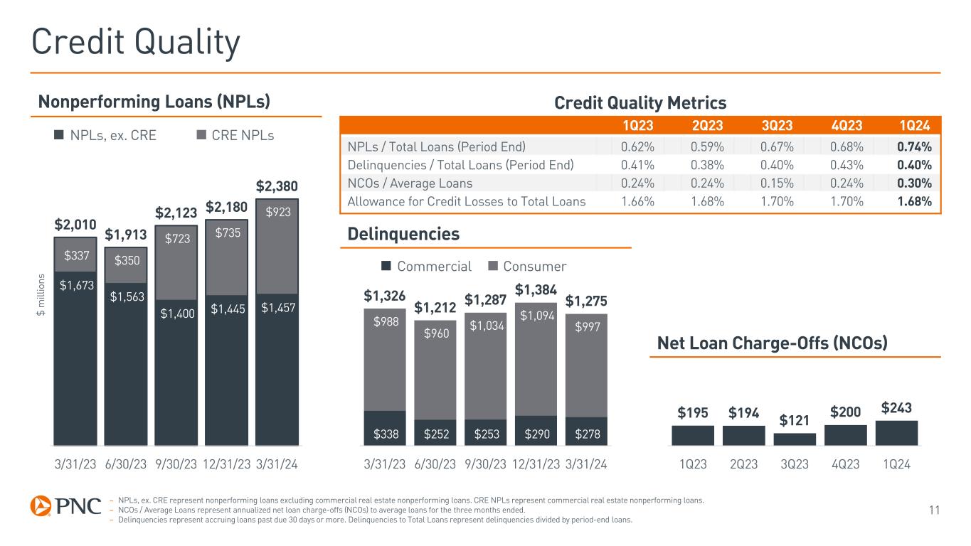 10 Well Controlled Core Noninterest Expense Noninterest Expense Details of Noninterest Expense % Change vs. $ millions 1Q24 4Q23 1Q23 Personnel $1,794 (10)% (2)% Occupancy 244 - (3)% Equipment 341 (7)% (3)% Marketing 64 (14)% (14)% Other 891 (37)% 9% Total noninterest expense $3,334 (18)% - Non-core noninterest expense (130) (80)% n/m Core noninterest expense (non-GAAP) $3,204 (6)% (4)% $3,321 $3,409 $3,204 1Q23 4Q23 1Q24 – Non-core noninterest expense represents the pre-tax impact of the FDIC’s special assessment related to the closures of SVB and Signature Bank ($130 million in 1Q24 and $515 million in 4Q23), as well as the workforce reduction charges incurred in 4Q23 ($150 million). – Core noninterest expense (non-GAAP) – See reconciliation in the Appendix. Core noninterest expense excludes non-core noninterest expense. Core noninterest expense Non-core noninterest expense $4,074 $3,334 $ m ill io ns