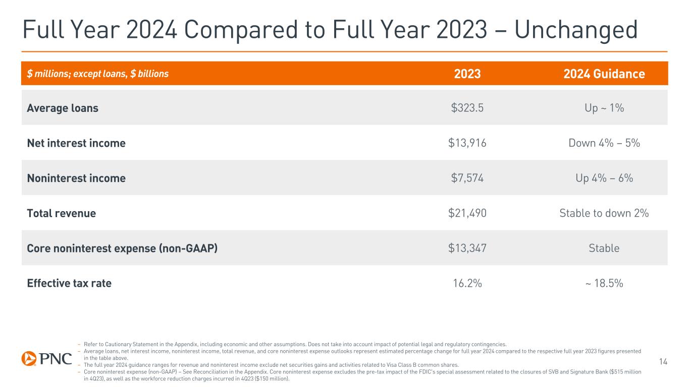 13 Second Quarter 2024 Compared to First Quarter 2024 $ millions; except loans, $ billions 1Q24 2Q24 Guidance Average loans $320.6 Stable Net interest income $3,264 Down ~ 1% Fee income $1,746 Up 1% – 2% Other noninterest income $135 $150 – $200 Total revenue $5,145 Stable Core noninterest expense (non-GAAP) $3,204 Up 2% – 4% Net charge-offs $243 $225 – $275 – Refer to Cautionary Statement in the Appendix, including economic and other assumptions. Does not take into account impact of potential legal and regulatory contingencies. – Average loans, net interest income, fee income, total revenue and core noninterest expense outlooks represent estimated percentage change for 2Q24 compared to the respective 1Q24 figures presented in the table above. – The second quarter 2024 guidance range for revenue and other noninterest income excludes net securities gains and activities related to Visa Class B common shares. – Core noninterest expense (non-GAAP) – See Reconciliation in the Appendix. Core noninterest expense excludes the pre-tax impact of the FDIC’s special assessment related to the closures of SVB and Signature Bank ($130 million in 1Q24)