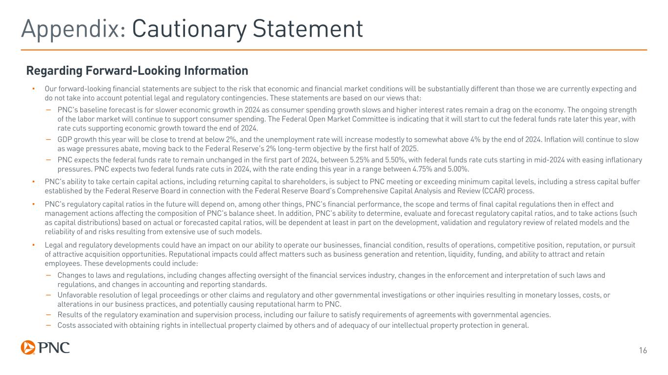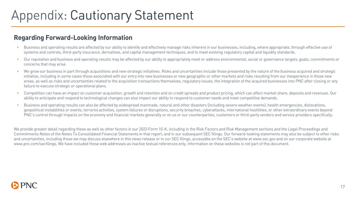 Appendix: Cautionary Statement 16 Regarding Forward-Looking Information • Our forward-looking financial statements are subject to the risk that economic and financial market conditions will be substantially different than those we are currently expecting and do not take into account potential legal and regulatory contingencies. These statements are based on our views that: − PNC’s baseline forecast is for slower economic growth in 2024 as consumer spending growth slows and higher interest rates remain a drag on the economy. The ongoing strength of the labor market will continue to support consumer spending. The Federal Open Market Committee is indicating that it will start to cut the federal funds rate later this year, with rate cuts supporting economic growth toward the end of 2024. − GDP growth this year will be close to trend at below 2%, and the unemployment rate will increase modestly to somewhat above 4% by the end of 2024. Inflation will continue to slow as wage pressures abate, moving back to the Federal Reserve’s 2% long-term objective by the first half of 2025. − PNC expects the federal funds rate to remain unchanged in the first part of 2024, between 5.25% and 5.50%, with federal funds rate cuts starting in mid-2024 with easing inflationary pressures. PNC expects two federal funds rate cuts in 2024, with the rate ending this year in a range between 4.75% and 5.00%. • PNC's ability to take certain capital actions, including returning capital to shareholders, is subject to PNC meeting or exceeding minimum capital levels, including a stress capital buffer established by the Federal Reserve Board in connection with the Federal Reserve Board's Comprehensive Capital Analysis and Review (CCAR) process. • PNC's regulatory capital ratios in the future will depend on, among other things, PNC's financial performance, the scope and terms of final capital regulations then in effect and management actions affecting the composition of PNC's balance sheet. In addition, PNC's ability to determine, evaluate and forecast regulatory capital ratios, and to take actions (such as capital distributions) based on actual or forecasted capital ratios, will be dependent at least in part on the development, validation and regulatory review of related models and the reliability of and risks resulting from extensive use of such models. • Legal and regulatory developments could have an impact on our ability to operate our businesses, financial condition, results of operations, competitive position, reputation, or pursuit of attractive acquisition opportunities. Reputational impacts could affect matters such as business generation and retention, liquidity, funding, and ability to attract and retain employees. These developments could include: − Changes to laws and regulations, including changes affecting oversight of the financial services industry, changes in the enforcement and interpretation of such laws and regulations, and changes in accounting and reporting standards. − Unfavorable resolution of legal proceedings or other claims and regulatory and other governmental investigations or other inquiries resulting in monetary losses, costs, or alterations in our business practices, and potentially causing reputational harm to PNC. − Results of the regulatory examination and supervision process, including our failure to satisfy requirements of agreements with governmental agencies. − Costs associated with obtaining rights in intellectual property claimed by others and of adequacy of our intellectual property protection in general.