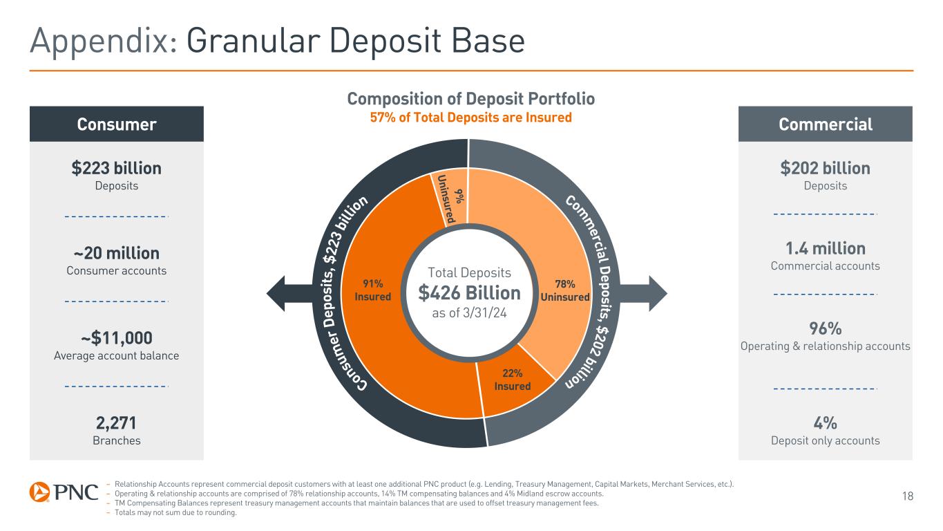 Appendix: Cautionary Statement 17 Regarding Forward-Looking Information • Business and operating results are affected by our ability to identify and effectively manage risks inherent in our businesses, including, where appropriate, through effective use of systems and controls, third-party insurance, derivatives, and capital management techniques, and to meet evolving regulatory capital and liquidity standards. • Our reputation and business and operating results may be affected by our ability to appropriately meet or address environmental, social or governance targets, goals, commitments or concerns that may arise. • We grow our business in part through acquisitions and new strategic initiatives. Risks and uncertainties include those presented by the nature of the business acquired and strategic initiative, including in some cases those associated with our entry into new businesses or new geographic or other markets and risks resulting from our inexperience in those new areas, as well as risks and uncertainties related to the acquisition transactions themselves, regulatory issues, the integration of the acquired businesses into PNC after closing or any failure to execute strategic or operational plans. • Competition can have an impact on customer acquisition, growth and retention and on credit spreads and product pricing, which can affect market share, deposits and revenues. Our ability to anticipate and respond to technological changes can also impact our ability to respond to customer needs and meet competitive demands. • Business and operating results can also be affected by widespread manmade, natural and other disasters (including severe weather events), health emergencies, dislocations, geopolitical instabilities or events, terrorist activities, system failures or disruptions, security breaches, cyberattacks, international hostilities, or other extraordinary events beyond PNC's control through impacts on the economy and financial markets generally or on us or our counterparties, customers or third-party vendors and service providers specifically. We provide greater detail regarding these as well as other factors in our 2023 Form 10-K, including in the Risk Factors and Risk Management sections and the Legal Proceedings and Commitments Notes of the Notes To Consolidated Financial Statements in that report, and in our subsequent SEC filings. Our forward-looking statements may also be subject to other risks and uncertainties, including those we may discuss elsewhere in this news release or in our SEC filings, accessible on the SEC's website at www.sec.gov and on our corporate website at www.pnc.com/secfilings. We have included these web addresses as inactive textual references only. Information on these websites is not part of this document.