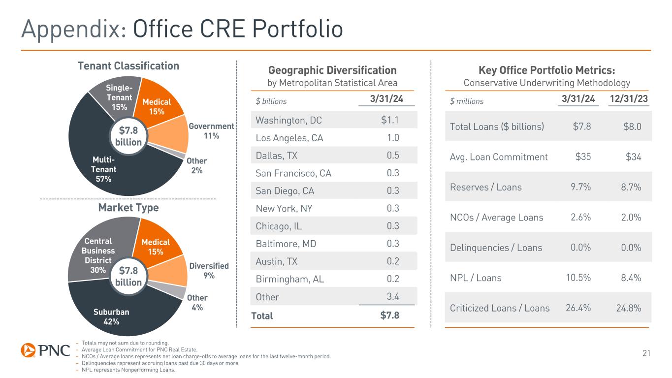 Appendix: Multifamily CRE Portfolio 20 Garden 48% Midrise 31% High Rise 9% Student 5% Other 7% CRE Multifamily Loans as of 3/31/24 Total $16.1 Billion – Totals may not sum due to rounding. – Average Loan Commitment for PNC Real Estate. – NCOs / Average loans represents net loan charge-offs to average loans for the last twelve-month period. – Delinquencies represent accruing loans past due 30 days or more. – NPL represents Nonperforming Loans. Geographic Diversification by Metropolitan Statistical Area $ billions 3/31/24 Miami, FL $1.1 Phoenix, AZ 0.9 Washington, DC 0.9 New York, NY 0.8 Dallas, TX 0.7 Houston, TX 0.7 Las Vegas, NV 0.7 Los Angeles, CA 0.7 San Diego, CA 0.5 Chicago, IL 0.5 Other 8.6 Total $16.1 Key Multifamily Portfolio Metrics: Conservative Underwriting Methodology $ millions 3/31/24 12/31/23 Avg. Loan Commitment $30 $30 Reserves / Loans 2.8% 2.5% NCOs / Average Loans 0.0% 0.0% Delinquencies / Loans 0.0% 0.1% NPL / Loans 0.3% 0.0% Criticized Loans / Loans 14.1% 12.2%