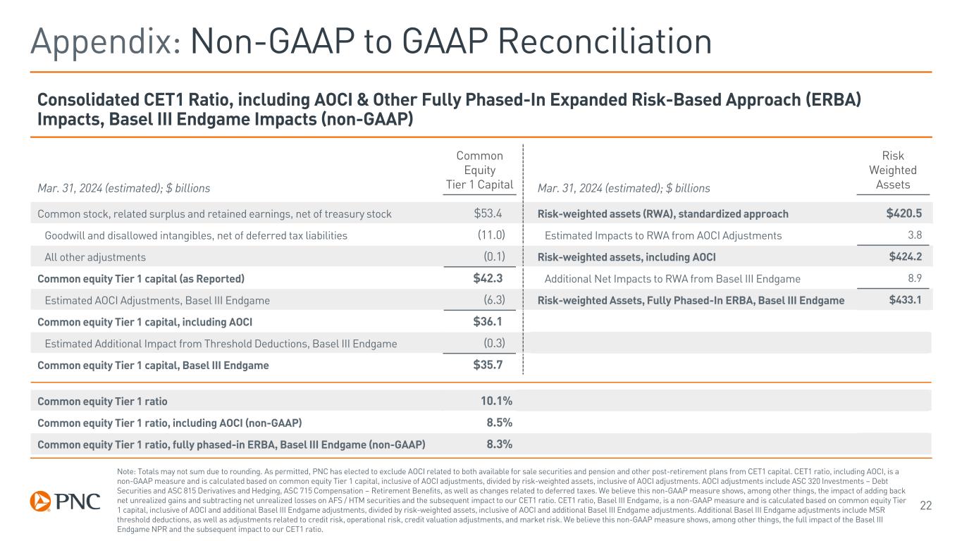 Appendix: Non-GAAP to GAAP Reconciliation 22 Mar. 31, 2024 (estimated); $ billions Common Equity Tier 1 Capital Mar. 31, 2024 (estimated); $ billions Risk Weighted Assets Common stock, related surplus and retained earnings, net of treasury stock $53.4 Risk-weighted assets (RWA), standardized approach $420.5 Goodwill and disallowed intangibles, net of deferred tax liabilities (11.0) Estimated Impacts to RWA from AOCI Adjustments 3.8 All other adjustments (0.1) Risk-weighted assets, including AOCI $424.2 Common equity Tier 1 capital (as Reported) $42.3 Additional Net Impacts to RWA from Basel III Endgame 8.9 Estimated AOCI Adjustments, Basel III Endgame (6.3) Risk-weighted Assets, Fully Phased-In ERBA, Basel III Endgame $433.1 Common equity Tier 1 capital, including AOCI $36.1 Estimated Additional Impact from Threshold Deductions, Basel III Endgame (0.3) Common equity Tier 1 capital, Basel III Endgame $35.7 Common equity Tier 1 ratio 10.1% Common equity Tier 1 ratio, including AOCI (non-GAAP) 8.5% Common equity Tier 1 ratio, fully phased-in ERBA, Basel III Endgame (non-GAAP) 8.3% Note: Totals may not sum due to rounding. As permitted, PNC has elected to exclude AOCI related to both available for sale securities and pension and other post-retirement plans from CET1 capital. CET1 ratio, including AOCI, is a non-GAAP measure and is calculated based on common equity Tier 1 capital, inclusive of AOCI adjustments, divided by risk-weighted assets, inclusive of AOCI adjustments. AOCI adjustments include ASC 320 Investments – Debt Securities and ASC 815 Derivatives and Hedging, ASC 715 Compensation – Retirement Benefits, as well as changes related to deferred taxes. We believe this non-GAAP measure shows, among other things, the impact of adding back net unrealized gains and subtracting net unrealized losses on AFS / HTM securities and the subsequent impact to our CET1 ratio. CET1 ratio, Basel III Endgame, is a non-GAAP measure and is calculated based on common equity Tier 1 capital, inclusive of AOCI and additional Basel III Endgame adjustments, divided by risk-weighted assets, inclusive of AOCI and additional Basel III Endgame adjustments. Additional Basel III Endgame adjustments include MSR threshold deductions, as well as adjustments related to credit risk, operational risk, credit valuation adjustments, and market risk. We believe this non-GAAP measure shows, among other things, the full impact of the Basel III Endgame NPR and the subsequent impact to our CET1 ratio. Consolidated CET1 Ratio, including AOCI & Other Fully Phased-In Expanded Risk-Based Approach (ERBA) Impacts, Basel III Endgame Impacts (non-GAAP)