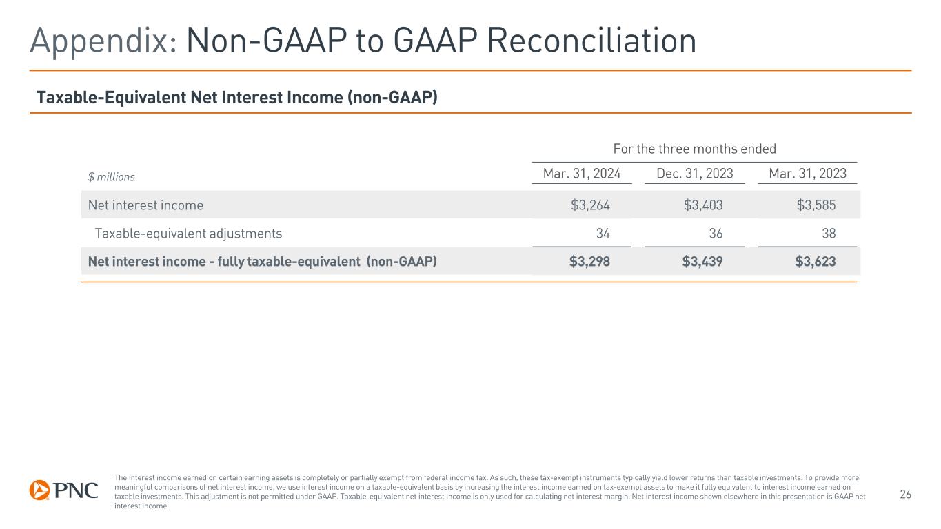 Appendix: Non-GAAP to GAAP Reconciliation 25 We believe that pretax, pre-provision earnings is a useful tool to help evaluate the ability to provide for credit costs through operations and provides an additional basis to compare results between periods by isolating the impact of provision for (recapture of) credit losses, which can vary significantly between periods. For the three months ended $ millions Mar. 31, 2024 Dec. 31, 2023 Mar. 31, 2023 Total Revenue $5,145 $5,361 $5,603 Total noninterest expense $3,334 $4,074 $3,321 Non-core noninterest expense (130) (665) Core noninterest expense (non-GAAP) $3,204 $3,409 $3,321 Pretax, pre-provision earnings (non-GAAP) $1,811 $1,287 $2,282 Pretax, pre-provision earnings, as adjusted (non-GAAP) $1,941 $1,952 $2,282 Pretax, Pre-Provision Earnings, as adjusted (non-GAAP)