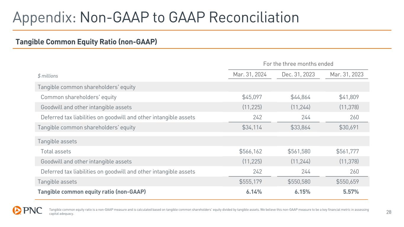 Appendix: Non-GAAP to GAAP Reconciliation 27 Tangible book value per common share is a non-GAAP measure and is calculated based on tangible common shareholders’ equity divided by period-end common shares outstanding. We believe this non-GAAP measure serves as a useful tool to help evaluate the strength and discipline of a company's capital management strategies and as an additional, conservative measure of total company value. For the three months ended $ millions, except per share data Mar. 31, 2024 Dec. 31, 2023 Mar. 31, 2023 Book value per common share $113.30 $112.72 $104.76 Tangible book value per common share Common shareholders’ equity $45,097 $44,864 $41,809 Goodwill and other intangible assets (11,225) (11,244) (11,378) Deferred tax liabilities on goodwill and other intangible assets 242 244 260 Tangible common shareholders' equity $34,114 $33,864 $30,691 Period-end common shares outstanding (in millions) 398 398 399 Tangible book value per common share (non-GAAP) $85.70 $85.08 $76.90 Tangible Book Value per Common Share (non-GAAP)