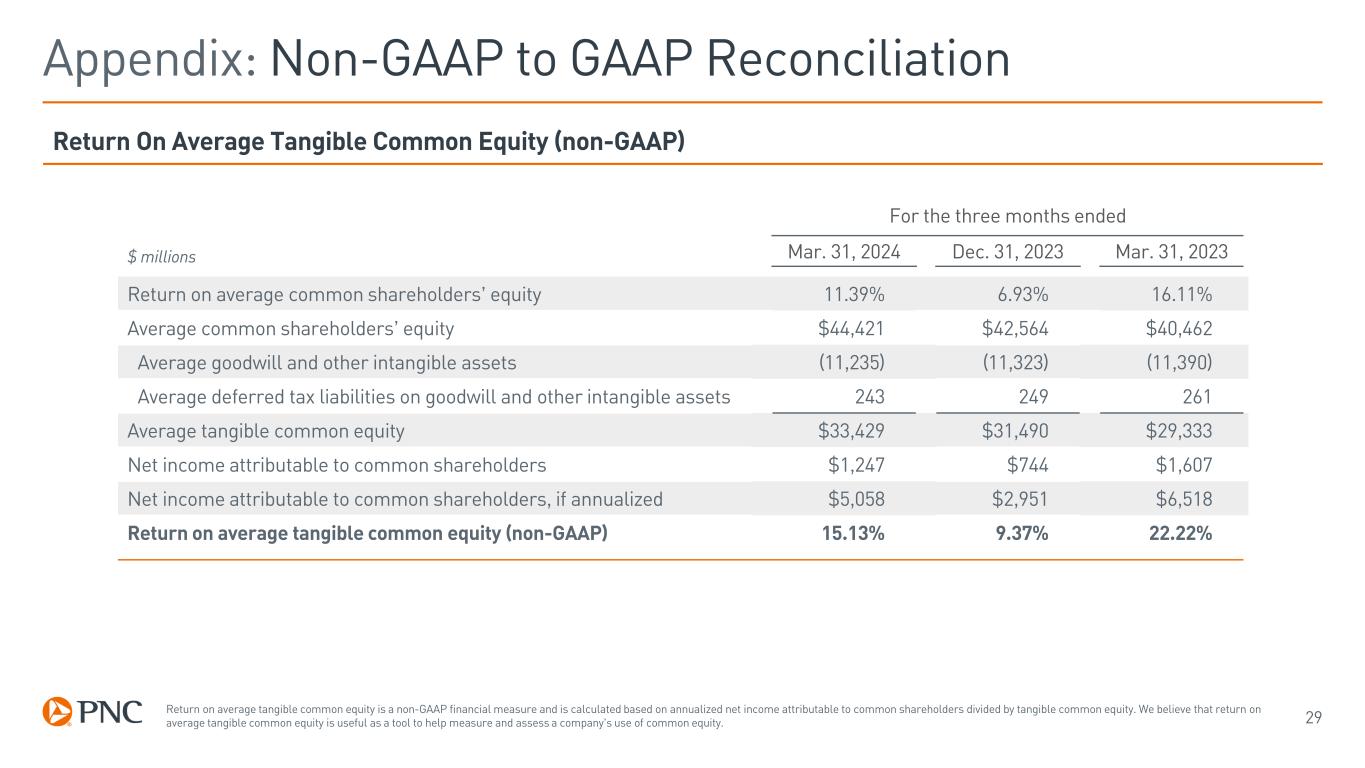 Appendix: Non-GAAP to GAAP Reconciliation 28 Tangible common equity ratio is a non-GAAP measure and is calculated based on tangible common shareholders’ equity divided by tangible assets. We believe this non-GAAP measure to be a key financial metric in assessing capital adequacy. For the three months ended $ millions Mar. 31, 2024 Dec. 31, 2023 Mar. 31, 2023 Tangible common shareholders’ equity Common shareholders’ equity $45,097 $44,864 $41,809 Goodwill and other intangible assets (11,225) (11,244) (11,378) Deferred tax liabilities on goodwill and other intangible assets 242 244 260 Tangible common shareholders' equity $34,114 $33,864 $30,691 Tangible assets Total assets $566,162 $561,580 $561,777 Goodwill and other intangible assets (11,225) (11,244) (11,378) Deferred tax liabilities on goodwill and other intangible assets 242 244 260 Tangible assets $555,179 $550,580 $550,659 Tangible common equity ratio (non-GAAP) 6.14% 6.15% 5.57% Tangible Common Equity Ratio (non-GAAP)