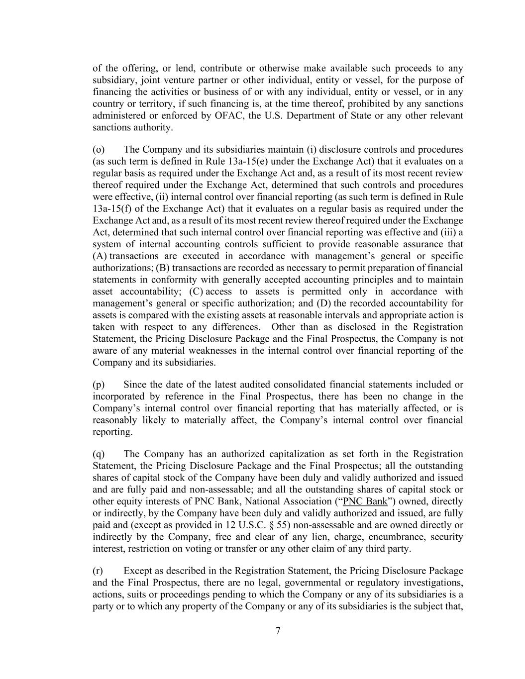 7 of the offering, or lend, contribute or otherwise make available such proceeds to any subsidiary, joint venture partner or other individual, entity or vessel, for the purpose of financing the activities or business of or with any individual, entity or vessel, or in any country or territory, if such financing is, at the time thereof, prohibited by any sanctions administered or enforced by OFAC, the U.S. Department of State or any other relevant sanctions authority. (o) The Company and its subsidiaries maintain (i) disclosure controls and procedures (as such term is defined in Rule 13a-15(e) under the Exchange Act) that it evaluates on a regular basis as required under the Exchange Act and, as a result of its most recent review thereof required under the Exchange Act, determined that such controls and procedures were effective, (ii) internal control over financial reporting (as such term is defined in Rule 13a-15(f) of the Exchange Act) that it evaluates on a regular basis as required under the Exchange Act and, as a result of its most recent review thereof required under the Exchange Act, determined that such internal control over financial reporting was effective and (iii) a system of internal accounting controls sufficient to provide reasonable assurance that (A) transactions are executed in accordance with management’s general or specific authorizations; (B) transactions are recorded as necessary to permit preparation of financial statements in conformity with generally accepted accounting principles and to maintain asset accountability; (C) access to assets is permitted only in accordance with management’s general or specific authorization; and (D) the recorded accountability for assets is compared with the existing assets at reasonable intervals and appropriate action is taken with respect to any differences. Other than as disclosed in the Registration Statement, the Pricing Disclosure Package and the Final Prospectus, the Company is not aware of any material weaknesses in the internal control over financial reporting of the Company and its subsidiaries. (p) Since the date of the latest audited consolidated financial statements included or incorporated by reference in the Final Prospectus, there has been no change in the Company’s internal control over financial reporting that has materially affected, or is reasonably likely to materially affect, the Company’s internal control over financial reporting. (q) The Company has an authorized capitalization as set forth in the Registration Statement, the Pricing Disclosure Package and the Final Prospectus; all the outstanding shares of capital stock of the Company have been duly and validly authorized and issued and are fully paid and non-assessable; and all the outstanding shares of capital stock or other equity interests of PNC Bank, National Association (“PNC Bank”) owned, directly or indirectly, by the Company have been duly and validly authorized and issued, are fully paid and (except as provided in 12 U.S.C. § 55) non-assessable and are owned directly or indirectly by the Company, free and clear of any lien, charge, encumbrance, security interest, restriction on voting or transfer or any other claim of any third party. (r) Except as described in the Registration Statement, the Pricing Disclosure Package and the Final Prospectus, there are no legal, governmental or regulatory investigations, actions, suits or proceedings pending to which the Company or any of its subsidiaries is a party or to which any property of the Company or any of its subsidiaries is the subject that,