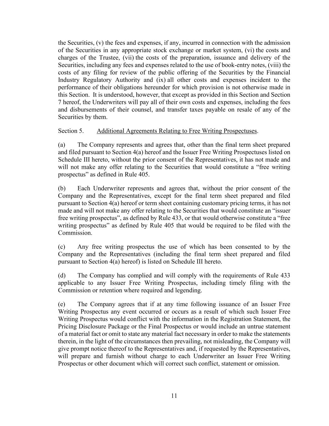 11 the Securities, (v) the fees and expenses, if any, incurred in connection with the admission of the Securities in any appropriate stock exchange or market system, (vi) the costs and charges of the Trustee, (vii) the costs of the preparation, issuance and delivery of the Securities, including any fees and expenses related to the use of book-entry notes, (viii) the costs of any filing for review of the public offering of the Securities by the Financial Industry Regulatory Authority and (ix) all other costs and expenses incident to the performance of their obligations hereunder for which provision is not otherwise made in this Section. It is understood, however, that except as provided in this Section and Section 7 hereof, the Underwriters will pay all of their own costs and expenses, including the fees and disbursements of their counsel, and transfer taxes payable on resale of any of the Securities by them. Section 5. Additional Agreements Relating to Free Writing Prospectuses. (a) The Company represents and agrees that, other than the final term sheet prepared and filed pursuant to Section 4(a) hereof and the Issuer Free Writing Prospectuses listed on Schedule III hereto, without the prior consent of the Representatives, it has not made and will not make any offer relating to the Securities that would constitute a “free writing prospectus” as defined in Rule 405. (b) Each Underwriter represents and agrees that, without the prior consent of the Company and the Representatives, except for the final term sheet prepared and filed pursuant to Section 4(a) hereof or term sheet containing customary pricing terms, it has not made and will not make any offer relating to the Securities that would constitute an “issuer free writing prospectus”, as defined by Rule 433, or that would otherwise constitute a “free writing prospectus” as defined by Rule 405 that would be required to be filed with the Commission. (c) Any free writing prospectus the use of which has been consented to by the Company and the Representatives (including the final term sheet prepared and filed pursuant to Section 4(a) hereof) is listed on Schedule III hereto. (d) The Company has complied and will comply with the requirements of Rule 433 applicable to any Issuer Free Writing Prospectus, including timely filing with the Commission or retention where required and legending. (e) The Company agrees that if at any time following issuance of an Issuer Free Writing Prospectus any event occurred or occurs as a result of which such Issuer Free Writing Prospectus would conflict with the information in the Registration Statement, the Pricing Disclosure Package or the Final Prospectus or would include an untrue statement of a material fact or omit to state any material fact necessary in order to make the statements therein, in the light of the circumstances then prevailing, not misleading, the Company will give prompt notice thereof to the Representatives and, if requested by the Representatives, will prepare and furnish without charge to each Underwriter an Issuer Free Writing Prospectus or other document which will correct such conflict, statement or omission.