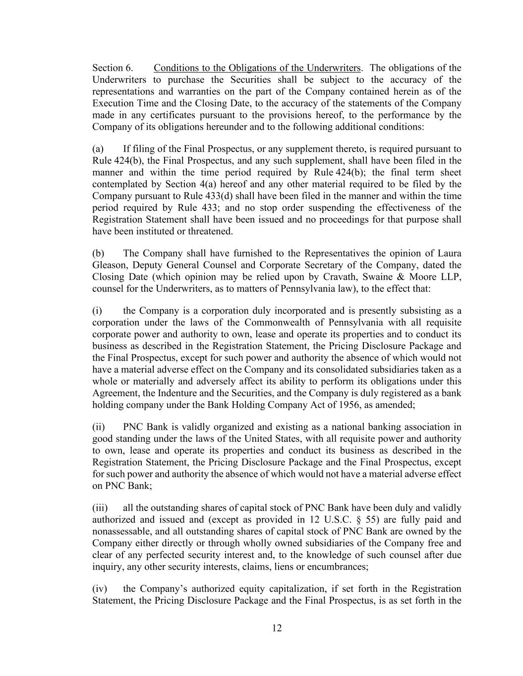 12 Section 6. Conditions to the Obligations of the Underwriters. The obligations of the Underwriters to purchase the Securities shall be subject to the accuracy of the representations and warranties on the part of the Company contained herein as of the Execution Time and the Closing Date, to the accuracy of the statements of the Company made in any certificates pursuant to the provisions hereof, to the performance by the Company of its obligations hereunder and to the following additional conditions: (a) If filing of the Final Prospectus, or any supplement thereto, is required pursuant to Rule 424(b), the Final Prospectus, and any such supplement, shall have been filed in the manner and within the time period required by Rule 424(b); the final term sheet contemplated by Section 4(a) hereof and any other material required to be filed by the Company pursuant to Rule 433(d) shall have been filed in the manner and within the time period required by Rule 433; and no stop order suspending the effectiveness of the Registration Statement shall have been issued and no proceedings for that purpose shall have been instituted or threatened. (b) The Company shall have furnished to the Representatives the opinion of Laura Gleason, Deputy General Counsel and Corporate Secretary of the Company, dated the Closing Date (which opinion may be relied upon by Cravath, Swaine & Moore LLP, counsel for the Underwriters, as to matters of Pennsylvania law), to the effect that: (i) the Company is a corporation duly incorporated and is presently subsisting as a corporation under the laws of the Commonwealth of Pennsylvania with all requisite corporate power and authority to own, lease and operate its properties and to conduct its business as described in the Registration Statement, the Pricing Disclosure Package and the Final Prospectus, except for such power and authority the absence of which would not have a material adverse effect on the Company and its consolidated subsidiaries taken as a whole or materially and adversely affect its ability to perform its obligations under this Agreement, the Indenture and the Securities, and the Company is duly registered as a bank holding company under the Bank Holding Company Act of 1956, as amended; (ii) PNC Bank is validly organized and existing as a national banking association in good standing under the laws of the United States, with all requisite power and authority to own, lease and operate its properties and conduct its business as described in the Registration Statement, the Pricing Disclosure Package and the Final Prospectus, except for such power and authority the absence of which would not have a material adverse effect on PNC Bank; (iii) all the outstanding shares of capital stock of PNC Bank have been duly and validly authorized and issued and (except as provided in 12 U.S.C. § 55) are fully paid and nonassessable, and all outstanding shares of capital stock of PNC Bank are owned by the Company either directly or through wholly owned subsidiaries of the Company free and clear of any perfected security interest and, to the knowledge of such counsel after due inquiry, any other security interests, claims, liens or encumbrances; (iv) the Company’s authorized equity capitalization, if set forth in the Registration Statement, the Pricing Disclosure Package and the Final Prospectus, is as set forth in the