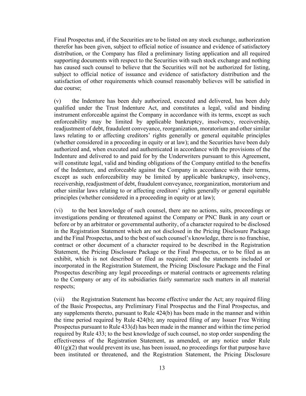 13 Final Prospectus and, if the Securities are to be listed on any stock exchange, authorization therefor has been given, subject to official notice of issuance and evidence of satisfactory distribution, or the Company has filed a preliminary listing application and all required supporting documents with respect to the Securities with such stock exchange and nothing has caused such counsel to believe that the Securities will not be authorized for listing, subject to official notice of issuance and evidence of satisfactory distribution and the satisfaction of other requirements which counsel reasonably believes will be satisfied in due course; (v) the Indenture has been duly authorized, executed and delivered, has been duly qualified under the Trust Indenture Act, and constitutes a legal, valid and binding instrument enforceable against the Company in accordance with its terms, except as such enforceability may be limited by applicable bankruptcy, insolvency, receivership, readjustment of debt, fraudulent conveyance, reorganization, moratorium and other similar laws relating to or affecting creditors’ rights generally or general equitable principles (whether considered in a proceeding in equity or at law); and the Securities have been duly authorized and, when executed and authenticated in accordance with the provisions of the Indenture and delivered to and paid for by the Underwriters pursuant to this Agreement, will constitute legal, valid and binding obligations of the Company entitled to the benefits of the Indenture, and enforceable against the Company in accordance with their terms, except as such enforceability may be limited by applicable bankruptcy, insolvency, receivership, readjustment of debt, fraudulent conveyance, reorganization, moratorium and other similar laws relating to or affecting creditors’ rights generally or general equitable principles (whether considered in a proceeding in equity or at law); (vi) to the best knowledge of such counsel, there are no actions, suits, proceedings or investigations pending or threatened against the Company or PNC Bank in any court or before or by an arbitrator or governmental authority, of a character required to be disclosed in the Registration Statement which are not disclosed in the Pricing Disclosure Package and the Final Prospectus, and to the best of such counsel’s knowledge, there is no franchise, contract or other document of a character required to be described in the Registration Statement, the Pricing Disclosure Package or the Final Prospectus, or to be filed as an exhibit, which is not described or filed as required; and the statements included or incorporated in the Registration Statement, the Pricing Disclosure Package and the Final Prospectus describing any legal proceedings or material contracts or agreements relating to the Company or any of its subsidiaries fairly summarize such matters in all material respects; (vii) the Registration Statement has become effective under the Act; any required filing of the Basic Prospectus, any Preliminary Final Prospectus and the Final Prospectus, and any supplements thereto, pursuant to Rule 424(b) has been made in the manner and within the time period required by Rule 424(b); any required filing of any Issuer Free Writing Prospectus pursuant to Rule 433(d) has been made in the manner and within the time period required by Rule 433; to the best knowledge of such counsel, no stop order suspending the effectiveness of the Registration Statement, as amended, or any notice under Rule 401(g)(2) that would prevent its use, has been issued, no proceedings for that purpose have been instituted or threatened, and the Registration Statement, the Pricing Disclosure