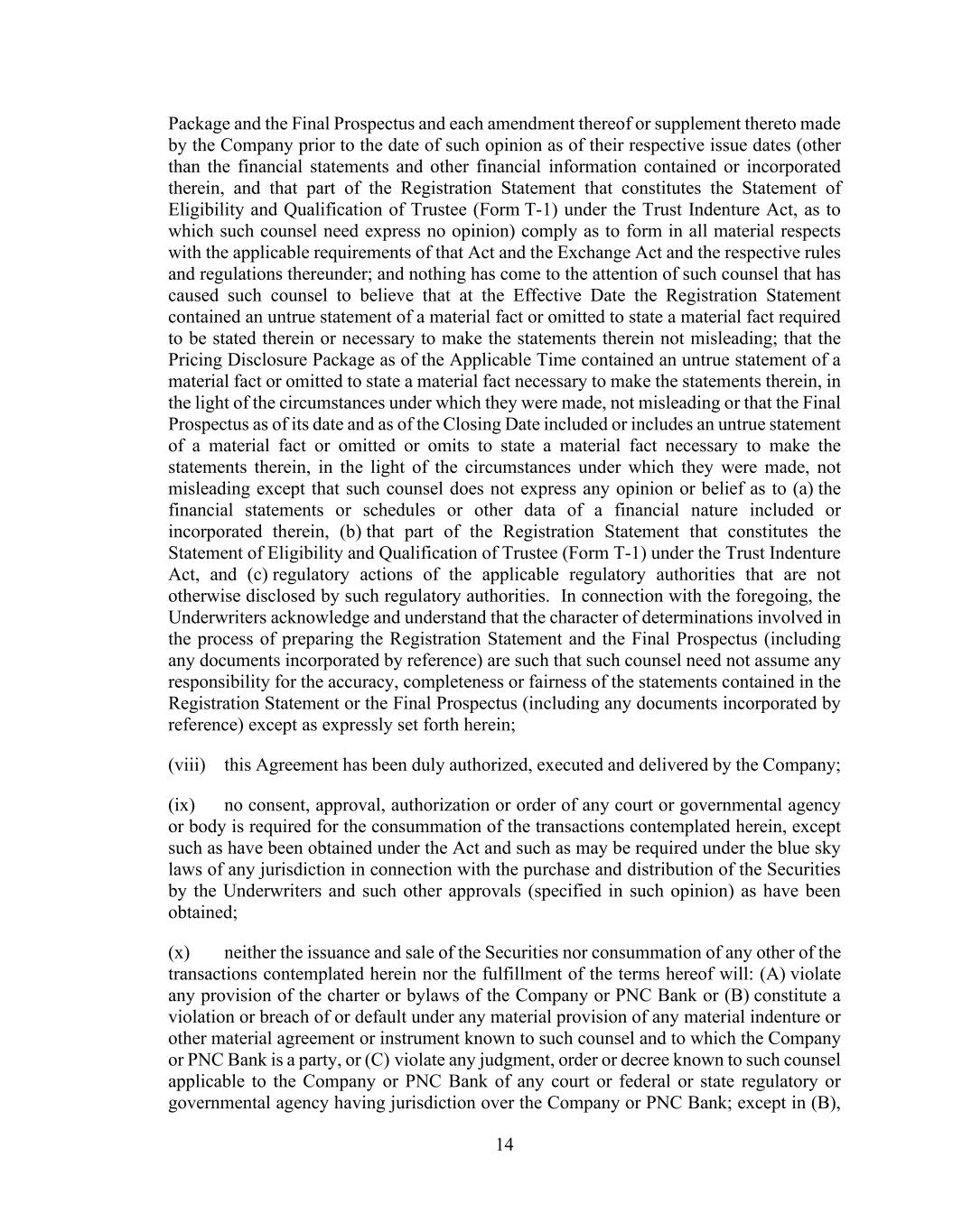 14 Package and the Final Prospectus and each amendment thereof or supplement thereto made by the Company prior to the date of such opinion as of their respective issue dates (other than the financial statements and other financial information contained or incorporated therein, and that part of the Registration Statement that constitutes the Statement of Eligibility and Qualification of Trustee (Form T-1) under the Trust Indenture Act, as to which such counsel need express no opinion) comply as to form in all material respects with the applicable requirements of that Act and the Exchange Act and the respective rules and regulations thereunder; and nothing has come to the attention of such counsel that has caused such counsel to believe that at the Effective Date the Registration Statement contained an untrue statement of a material fact or omitted to state a material fact required to be stated therein or necessary to make the statements therein not misleading; that the Pricing Disclosure Package as of the Applicable Time contained an untrue statement of a material fact or omitted to state a material fact necessary to make the statements therein, in the light of the circumstances under which they were made, not misleading or that the Final Prospectus as of its date and as of the Closing Date included or includes an untrue statement of a material fact or omitted or omits to state a material fact necessary to make the statements therein, in the light of the circumstances under which they were made, not misleading except that such counsel does not express any opinion or belief as to (a) the financial statements or schedules or other data of a financial nature included or incorporated therein, (b) that part of the Registration Statement that constitutes the Statement of Eligibility and Qualification of Trustee (Form T-1) under the Trust Indenture Act, and (c) regulatory actions of the applicable regulatory authorities that are not otherwise disclosed by such regulatory authorities. In connection with the foregoing, the Underwriters acknowledge and understand that the character of determinations involved in the process of preparing the Registration Statement and the Final Prospectus (including any documents incorporated by reference) are such that such counsel need not assume any responsibility for the accuracy, completeness or fairness of the statements contained in the Registration Statement or the Final Prospectus (including any documents incorporated by reference) except as expressly set forth herein; (viii) this Agreement has been duly authorized, executed and delivered by the Company; (ix) no consent, approval, authorization or order of any court or governmental agency or body is required for the consummation of the transactions contemplated herein, except such as have been obtained under the Act and such as may be required under the blue sky laws of any jurisdiction in connection with the purchase and distribution of the Securities by the Underwriters and such other approvals (specified in such opinion) as have been obtained; (x) neither the issuance and sale of the Securities nor consummation of any other of the transactions contemplated herein nor the fulfillment of the terms hereof will: (A) violate any provision of the charter or bylaws of the Company or PNC Bank or (B) constitute a violation or breach of or default under any material provision of any material indenture or other material agreement or instrument known to such counsel and to which the Company or PNC Bank is a party, or (C) violate any judgment, order or decree known to such counsel applicable to the Company or PNC Bank of any court or federal or state regulatory or governmental agency having jurisdiction over the Company or PNC Bank; except in (B),