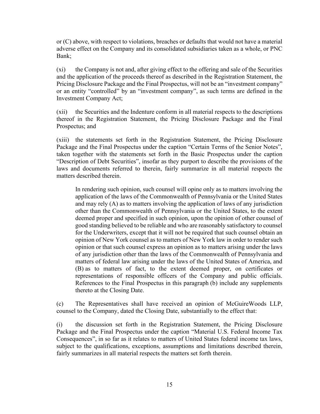 15 or (C) above, with respect to violations, breaches or defaults that would not have a material adverse effect on the Company and its consolidated subsidiaries taken as a whole, or PNC Bank; (xi) the Company is not and, after giving effect to the offering and sale of the Securities and the application of the proceeds thereof as described in the Registration Statement, the Pricing Disclosure Package and the Final Prospectus, will not be an “investment company” or an entity “controlled” by an “investment company”, as such terms are defined in the Investment Company Act; (xii) the Securities and the Indenture conform in all material respects to the descriptions thereof in the Registration Statement, the Pricing Disclosure Package and the Final Prospectus; and (xiii) the statements set forth in the Registration Statement, the Pricing Disclosure Package and the Final Prospectus under the caption “Certain Terms of the Senior Notes”, taken together with the statements set forth in the Basic Prospectus under the caption “Description of Debt Securities”, insofar as they purport to describe the provisions of the laws and documents referred to therein, fairly summarize in all material respects the matters described therein. In rendering such opinion, such counsel will opine only as to matters involving the application of the laws of the Commonwealth of Pennsylvania or the United States and may rely (A) as to matters involving the application of laws of any jurisdiction other than the Commonwealth of Pennsylvania or the United States, to the extent deemed proper and specified in such opinion, upon the opinion of other counsel of good standing believed to be reliable and who are reasonably satisfactory to counsel for the Underwriters, except that it will not be required that such counsel obtain an opinion of New York counsel as to matters of New York law in order to render such opinion or that such counsel express an opinion as to matters arising under the laws of any jurisdiction other than the laws of the Commonwealth of Pennsylvania and matters of federal law arising under the laws of the United States of America, and (B) as to matters of fact, to the extent deemed proper, on certificates or representations of responsible officers of the Company and public officials. References to the Final Prospectus in this paragraph (b) include any supplements thereto at the Closing Date. (c) The Representatives shall have received an opinion of McGuireWoods LLP, counsel to the Company, dated the Closing Date, substantially to the effect that: (i) the discussion set forth in the Registration Statement, the Pricing Disclosure Package and the Final Prospectus under the caption “Material U.S. Federal Income Tax Consequences”, in so far as it relates to matters of United States federal income tax laws, subject to the qualifications, exceptions, assumptions and limitations described therein, fairly summarizes in all material respects the matters set forth therein.