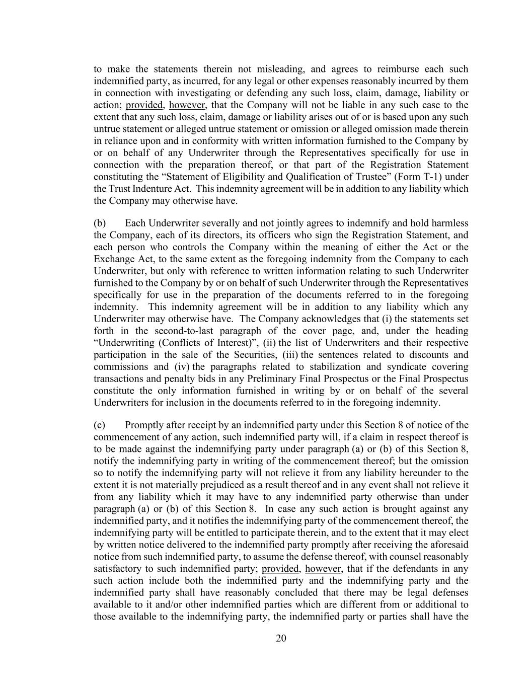 20 to make the statements therein not misleading, and agrees to reimburse each such indemnified party, as incurred, for any legal or other expenses reasonably incurred by them in connection with investigating or defending any such loss, claim, damage, liability or action; provided, however, that the Company will not be liable in any such case to the extent that any such loss, claim, damage or liability arises out of or is based upon any such untrue statement or alleged untrue statement or omission or alleged omission made therein in reliance upon and in conformity with written information furnished to the Company by or on behalf of any Underwriter through the Representatives specifically for use in connection with the preparation thereof, or that part of the Registration Statement constituting the “Statement of Eligibility and Qualification of Trustee” (Form T-1) under the Trust Indenture Act. This indemnity agreement will be in addition to any liability which the Company may otherwise have. (b) Each Underwriter severally and not jointly agrees to indemnify and hold harmless the Company, each of its directors, its officers who sign the Registration Statement, and each person who controls the Company within the meaning of either the Act or the Exchange Act, to the same extent as the foregoing indemnity from the Company to each Underwriter, but only with reference to written information relating to such Underwriter furnished to the Company by or on behalf of such Underwriter through the Representatives specifically for use in the preparation of the documents referred to in the foregoing indemnity. This indemnity agreement will be in addition to any liability which any Underwriter may otherwise have. The Company acknowledges that (i) the statements set forth in the second-to-last paragraph of the cover page, and, under the heading “Underwriting (Conflicts of Interest)”, (ii) the list of Underwriters and their respective participation in the sale of the Securities, (iii) the sentences related to discounts and commissions and (iv) the paragraphs related to stabilization and syndicate covering transactions and penalty bids in any Preliminary Final Prospectus or the Final Prospectus constitute the only information furnished in writing by or on behalf of the several Underwriters for inclusion in the documents referred to in the foregoing indemnity. (c) Promptly after receipt by an indemnified party under this Section 8 of notice of the commencement of any action, such indemnified party will, if a claim in respect thereof is to be made against the indemnifying party under paragraph (a) or (b) of this Section 8, notify the indemnifying party in writing of the commencement thereof; but the omission so to notify the indemnifying party will not relieve it from any liability hereunder to the extent it is not materially prejudiced as a result thereof and in any event shall not relieve it from any liability which it may have to any indemnified party otherwise than under paragraph (a) or (b) of this Section 8. In case any such action is brought against any indemnified party, and it notifies the indemnifying party of the commencement thereof, the indemnifying party will be entitled to participate therein, and to the extent that it may elect by written notice delivered to the indemnified party promptly after receiving the aforesaid notice from such indemnified party, to assume the defense thereof, with counsel reasonably satisfactory to such indemnified party; provided, however, that if the defendants in any such action include both the indemnified party and the indemnifying party and the indemnified party shall have reasonably concluded that there may be legal defenses available to it and/or other indemnified parties which are different from or additional to those available to the indemnifying party, the indemnified party or parties shall have the