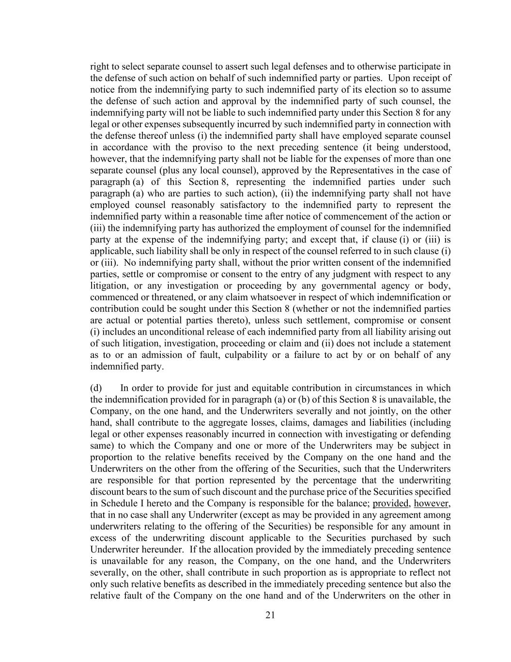 21 right to select separate counsel to assert such legal defenses and to otherwise participate in the defense of such action on behalf of such indemnified party or parties. Upon receipt of notice from the indemnifying party to such indemnified party of its election so to assume the defense of such action and approval by the indemnified party of such counsel, the indemnifying party will not be liable to such indemnified party under this Section 8 for any legal or other expenses subsequently incurred by such indemnified party in connection with the defense thereof unless (i) the indemnified party shall have employed separate counsel in accordance with the proviso to the next preceding sentence (it being understood, however, that the indemnifying party shall not be liable for the expenses of more than one separate counsel (plus any local counsel), approved by the Representatives in the case of paragraph (a) of this Section 8, representing the indemnified parties under such paragraph (a) who are parties to such action), (ii) the indemnifying party shall not have employed counsel reasonably satisfactory to the indemnified party to represent the indemnified party within a reasonable time after notice of commencement of the action or (iii) the indemnifying party has authorized the employment of counsel for the indemnified party at the expense of the indemnifying party; and except that, if clause (i) or (iii) is applicable, such liability shall be only in respect of the counsel referred to in such clause (i) or (iii). No indemnifying party shall, without the prior written consent of the indemnified parties, settle or compromise or consent to the entry of any judgment with respect to any litigation, or any investigation or proceeding by any governmental agency or body, commenced or threatened, or any claim whatsoever in respect of which indemnification or contribution could be sought under this Section 8 (whether or not the indemnified parties are actual or potential parties thereto), unless such settlement, compromise or consent (i) includes an unconditional release of each indemnified party from all liability arising out of such litigation, investigation, proceeding or claim and (ii) does not include a statement as to or an admission of fault, culpability or a failure to act by or on behalf of any indemnified party. (d) In order to provide for just and equitable contribution in circumstances in which the indemnification provided for in paragraph (a) or (b) of this Section 8 is unavailable, the Company, on the one hand, and the Underwriters severally and not jointly, on the other hand, shall contribute to the aggregate losses, claims, damages and liabilities (including legal or other expenses reasonably incurred in connection with investigating or defending same) to which the Company and one or more of the Underwriters may be subject in proportion to the relative benefits received by the Company on the one hand and the Underwriters on the other from the offering of the Securities, such that the Underwriters are responsible for that portion represented by the percentage that the underwriting discount bears to the sum of such discount and the purchase price of the Securities specified in Schedule I hereto and the Company is responsible for the balance; provided, however, that in no case shall any Underwriter (except as may be provided in any agreement among underwriters relating to the offering of the Securities) be responsible for any amount in excess of the underwriting discount applicable to the Securities purchased by such Underwriter hereunder. If the allocation provided by the immediately preceding sentence is unavailable for any reason, the Company, on the one hand, and the Underwriters severally, on the other, shall contribute in such proportion as is appropriate to reflect not only such relative benefits as described in the immediately preceding sentence but also the relative fault of the Company on the one hand and of the Underwriters on the other in