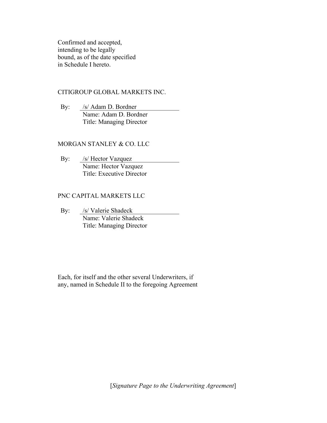 [Signature Page to the Underwriting Agreement] Confirmed and accepted, intending to be legally bound, as of the date specified in Schedule I hereto. CITIGROUP GLOBAL MARKETS INC. By: /s/ Adam D. Bordner Name: Adam D. Bordner Title: Managing Director MORGAN STANLEY & CO. LLC By: /s/ Hector Vazquez Name: Hector Vazquez Title: Executive Director PNC CAPITAL MARKETS LLC By: /s/ Valerie Shadeck Name: Valerie Shadeck Title: Managing Director Each, for itself and the other several Underwriters, if any, named in Schedule II to the foregoing Agreement