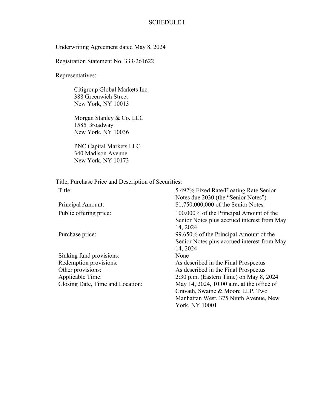 SCHEDULE I Underwriting Agreement dated May 8, 2024 Registration Statement No. 333-261622 Representatives: Citigroup Global Markets Inc. 388 Greenwich Street New York, NY 10013 Morgan Stanley & Co. LLC 1585 Broadway New York, NY 10036 PNC Capital Markets LLC 340 Madison Avenue New York, NY 10173 Title, Purchase Price and Description of Securities: Title: 5.492% Fixed Rate/Floating Rate Senior Notes due 2030 (the “Senior Notes”) Principal Amount: $1,750,000,000 of the Senior Notes Public offering price: 100.000% of the Principal Amount of the Senior Notes plus accrued interest from May 14, 2024 Purchase price: 99.650% of the Principal Amount of the Senior Notes plus accrued interest from May 14, 2024 Sinking fund provisions: None Redemption provisions: As described in the Final Prospectus Other provisions: As described in the Final Prospectus Applicable Time: 2:30 p.m. (Eastern Time) on May 8, 2024 Closing Date, Time and Location: May 14, 2024, 10:00 a.m. at the office of Cravath, Swaine & Moore LLP, Two Manhattan West, 375 Ninth Avenue, New York, NY 10001