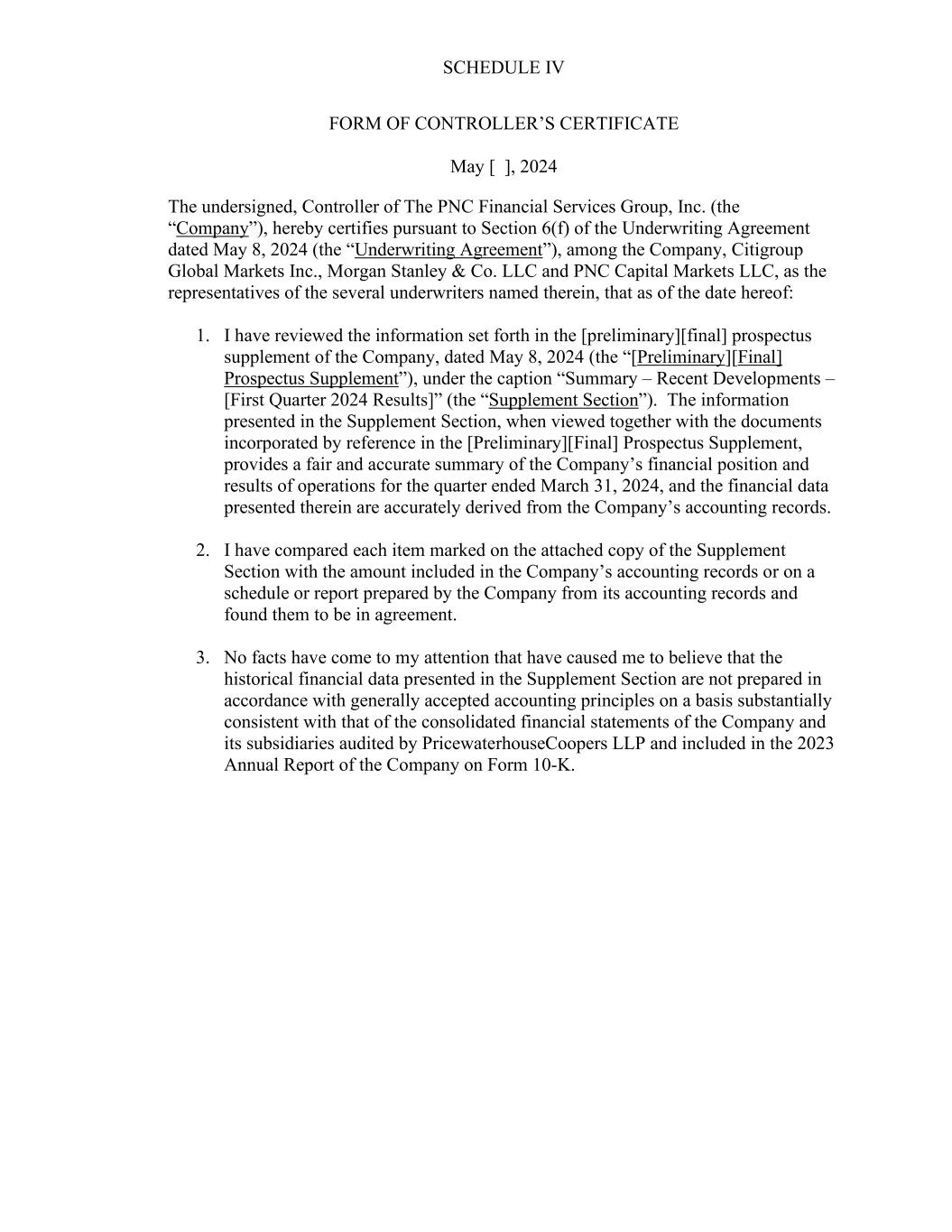 SCHEDULE IV FORM OF CONTROLLER’S CERTIFICATE May [ ], 2024 The undersigned, Controller of The PNC Financial Services Group, Inc. (the “Company”), hereby certifies pursuant to Section 6(f) of the Underwriting Agreement dated May 8, 2024 (the “Underwriting Agreement”), among the Company, Citigroup Global Markets Inc., Morgan Stanley & Co. LLC and PNC Capital Markets LLC, as the representatives of the several underwriters named therein, that as of the date hereof: 1. I have reviewed the information set forth in the [preliminary][final] prospectus supplement of the Company, dated May 8, 2024 (the “[Preliminary][Final] Prospectus Supplement”), under the caption “Summary – Recent Developments – [First Quarter 2024 Results]” (the “Supplement Section”). The information presented in the Supplement Section, when viewed together with the documents incorporated by reference in the [Preliminary][Final] Prospectus Supplement, provides a fair and accurate summary of the Company’s financial position and results of operations for the quarter ended March 31, 2024, and the financial data presented therein are accurately derived from the Company’s accounting records. 2. I have compared each item marked on the attached copy of the Supplement Section with the amount included in the Company’s accounting records or on a schedule or report prepared by the Company from its accounting records and found them to be in agreement. 3. No facts have come to my attention that have caused me to believe that the historical financial data presented in the Supplement Section are not prepared in accordance with generally accepted accounting principles on a basis substantially consistent with that of the consolidated financial statements of the Company and its subsidiaries audited by PricewaterhouseCoopers LLP and included in the 2023 Annual Report of the Company on Form 10-K.